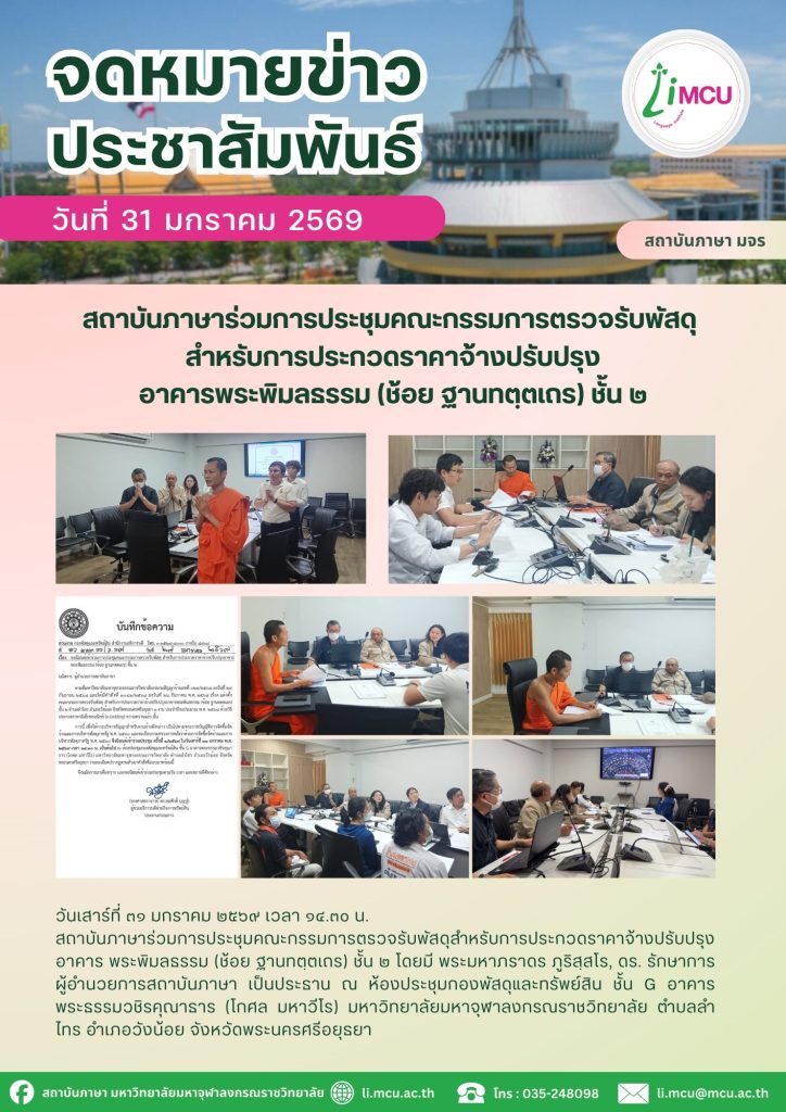 สถาบันภาษาร่วมการประชุมคณะกรรมการตรวจรับพัสดุ สำหรับการประกวดราคาจ้างปรับปรุง อาคารพระพิมลธรรม (ช้อย ฐานทตฺตเถร) ชั้น ๒