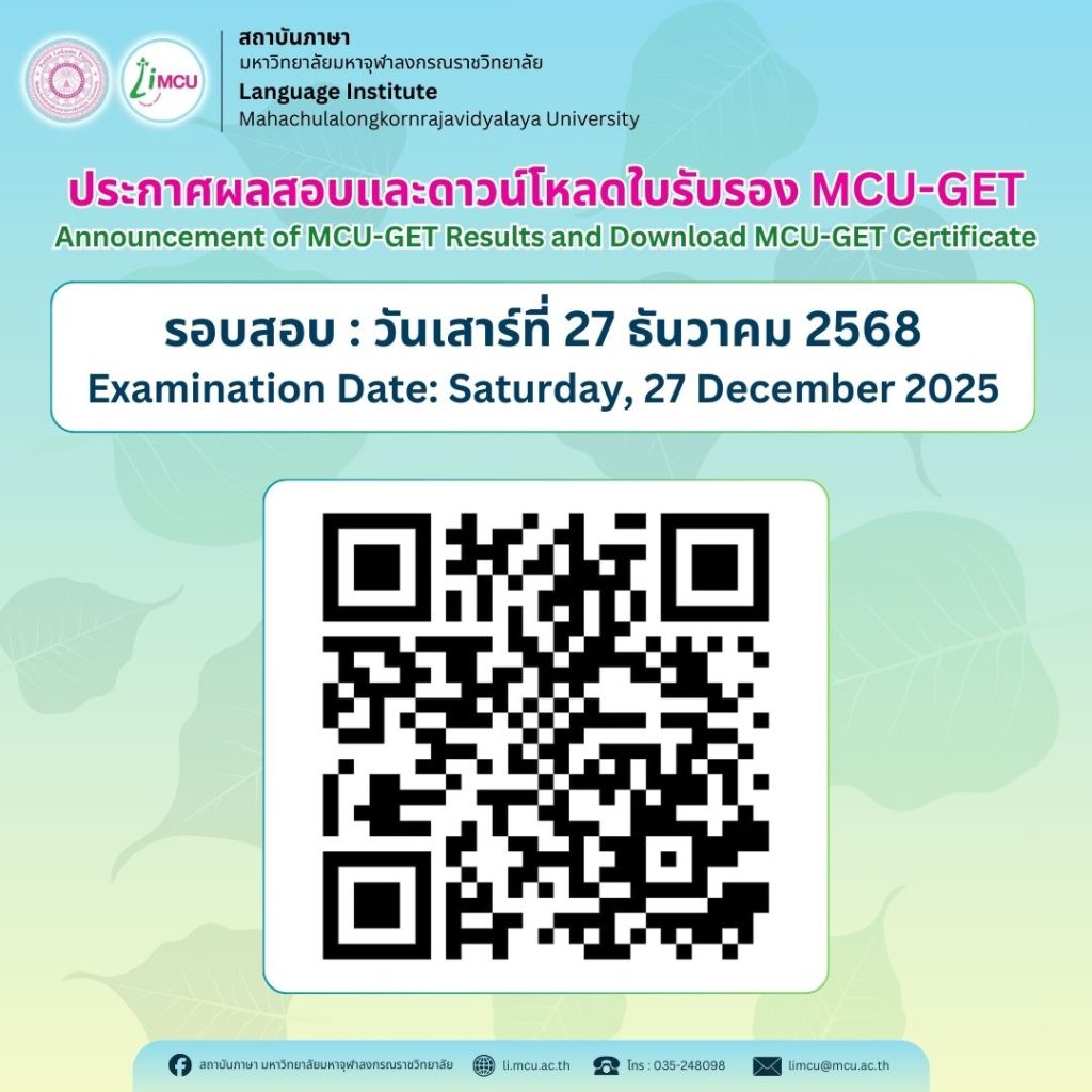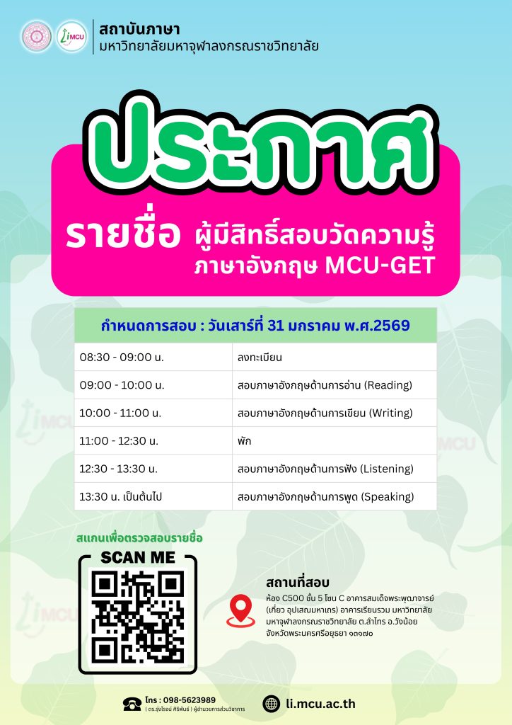 📢 ประกาศรายชื่อผู้มีสิทธิ์สอบวัดความรู้ภาษาอังกฤษ MCU-GET ครั้งที่ 1/2569 ประจำเดือน มกราคม 2569 📝