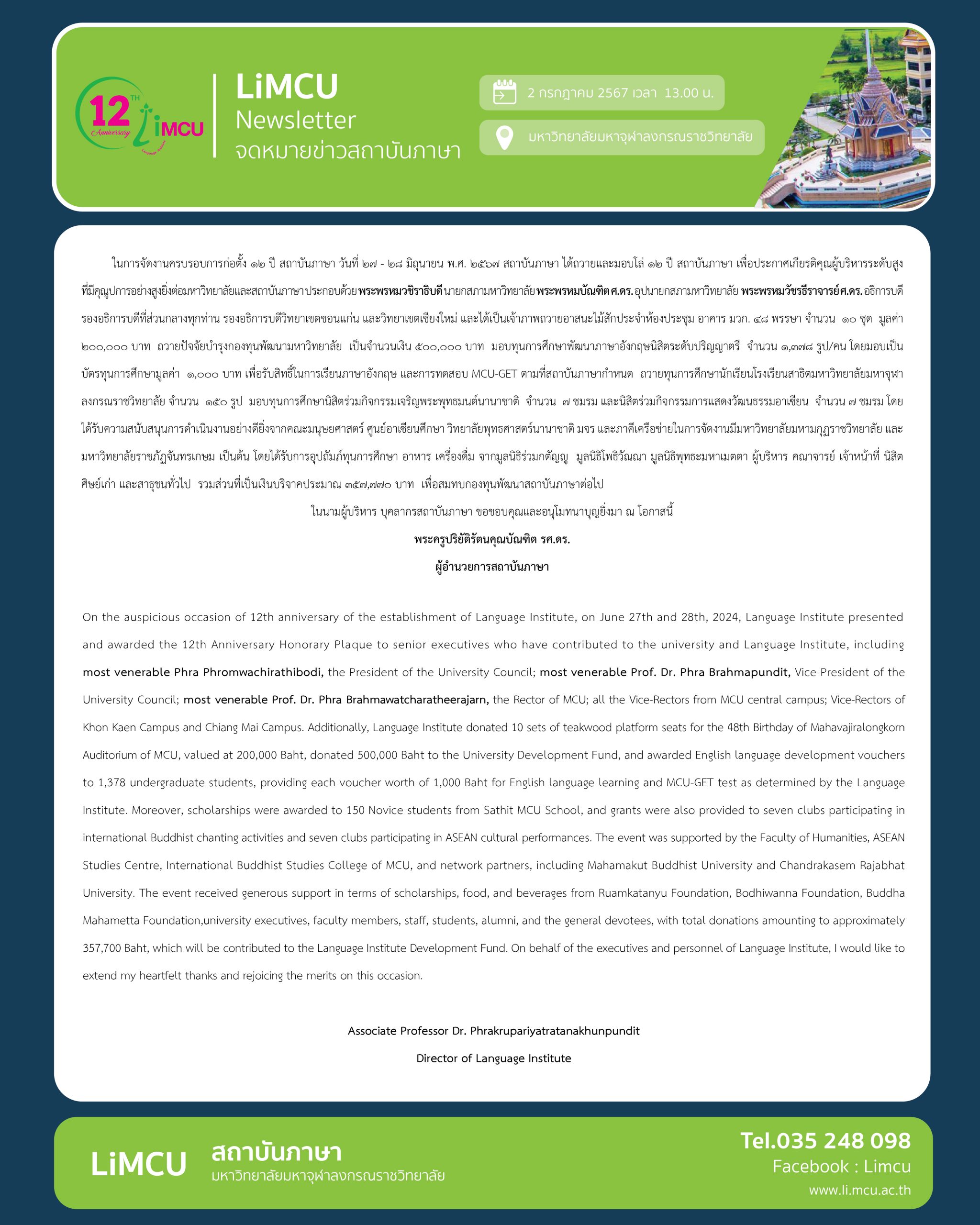 On the auspicious occasion of 12th anniversary of the establishment of Language Institute, on June 27th and 28th, 2024, Language Institute presented and awarded the 12th Anniversary Honorary Plaque to senior executives who have contributed to the university and Language Institute, including most venerable Phra Phromwachirathibodi, the President of the University Council; most venerable Prof. Dr. Phra Brahmapundit, Vice-President of the University Council; most venerable Prof. Dr. Phra Brahmawatcharatheerajarn, the Rector of MCU; all the Vice-Rectors from MCU central campus; Vice-Rectors of Khon Kaen Campus and Chiang Mai Campus. Additionally, Language Institute donated 10 sets of teakwood platform seats for the 48th Birthday of Mahavajiralongkorn Auditorium of MCU, valued at 200,000 Baht, donated 500,000 Baht to the University Development Fund, and awarded English language development vouchers to 1,378 undergraduate students, providing each voucher worth of 1,000 Baht for English language learning and MCU-GET test as determined by the Language Institute. Moreover, scholarships were awarded to 150 Novice students from Sathit MCU School, and grants were also provided to seven clubs participating in international Buddhist chanting activities and seven clubs participating in ASEAN cultural performances. The event was supported by the Faculty of Humanities, ASEAN Studies Centre, International Buddhist Studies College of MCU, and network partners, including Mahamakut Buddhist University and Chandrakasem Rajabhat University. The event received generous support in terms of scholarships, food, and beverages from Ruamkatanyu Foundation, Bodhiwanna Foundation, Buddha Mahametta Foundation, university executives, faculty members, staff, students, alumni, and the general devotees, with total donations amounting to approximately357,770 Baht, which will be contributed to the Language Institute Development Fund. On behalf of the executives and personnel of Language Institute, I would like to extend my heartfelt thanks and rejoicing the merits on this occasion.
