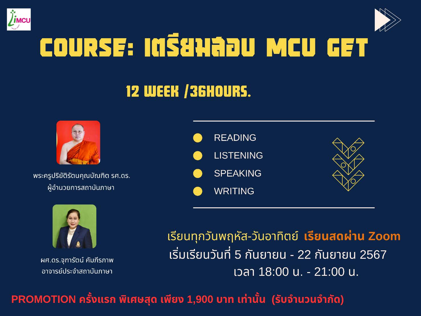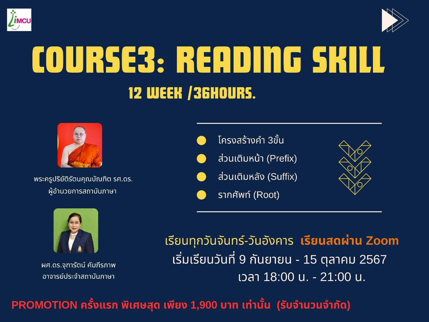 เรียนทุกวันจันทร์และอังคารเริ่มวันที่ 9 กันยายน – 15 ตุลาคม 2567