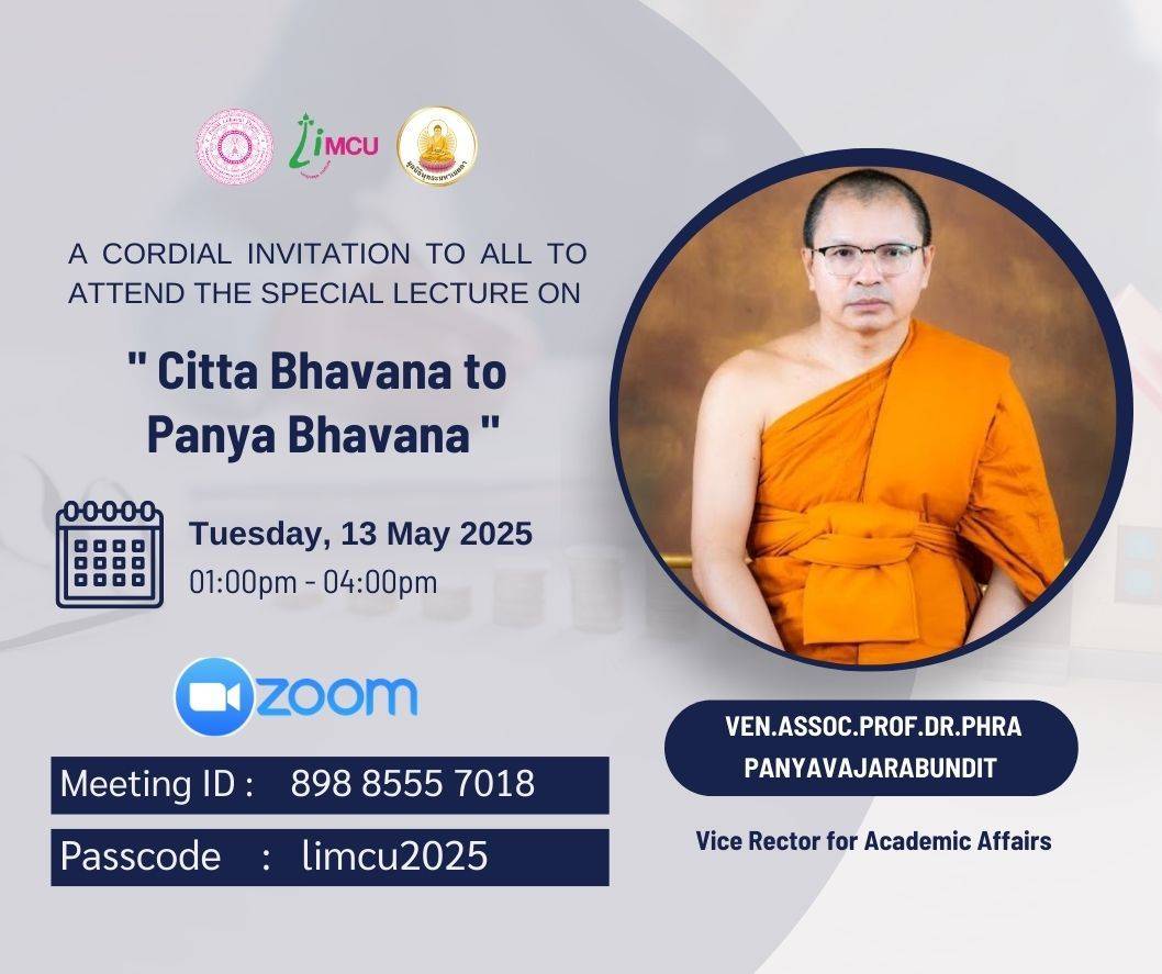 Ven.Assoc.Prof.Dr.Phra Panyavajrapandit is scheduled to give another lecture for the course on the topic “Citta Bhavana to Vipassana Bhavana” on May 13, 2025, from 1:00–4:00 PM, at training room (Luangphor Pan’s Room). Participation is free of charge via Zoom (ID: 898 8555 7018, Passcode: limcu2025)
