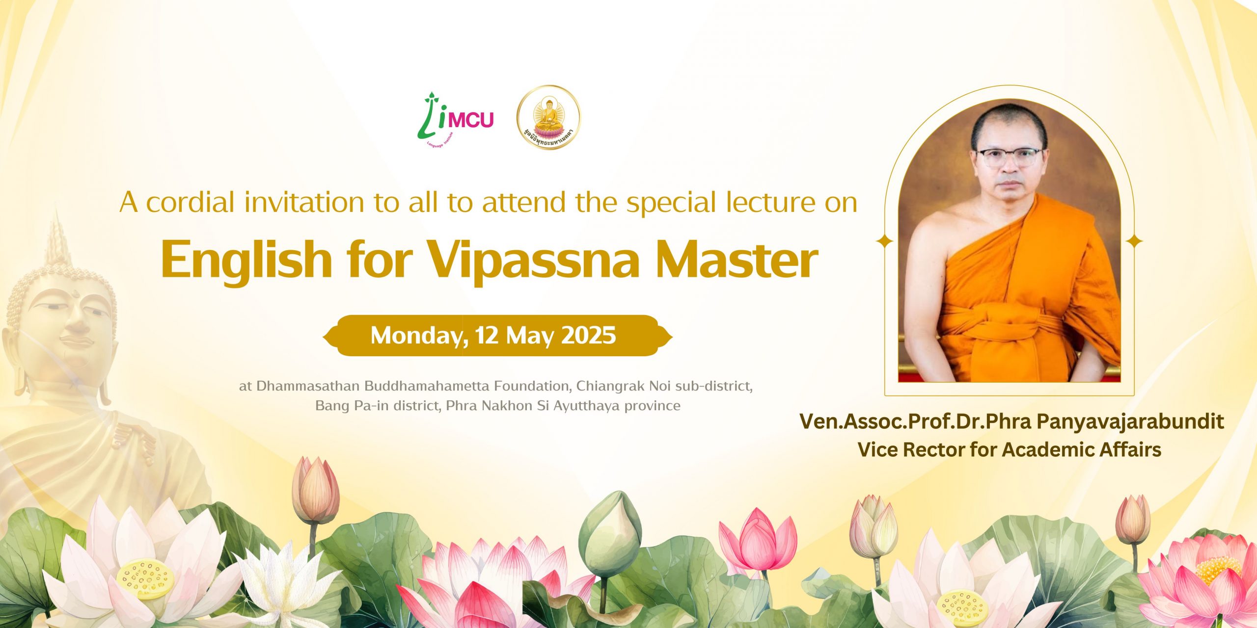 วันที่ 12 พ.ค. 2568 พระปัญญาวัชรบัณฑิต รศ.ดร.รองอธิการบดีฝ่ายวิชาการ มจร. บรรยายพิเศษในหัวข้อ “English for Vipassana Master” ในเวลา 09.00-11.00 น. และ 13.00-16.00 น. สำหรับหลักสูตรภาษาอังกฤษแบบเข้มข้นสำหรับพระวิปัสสนาจารย์ ที่จัดขึ้นโดยสถาบันภาษา มหาวิทยาลัยมหาจุฬาลงกรณราชวิทยาลัย ร่วมกับ พระภาวนาวชิรสุนทร วิ. ประธานมูลนิธิพุทธะมหาเมตตา ณ ธรรมสถานมูลนิธิพุทธะมหาเมตตา ตำบลเชียงรากน้อย อำเภอบางปะอิน จังหวัดพระนครศรีอยุธยา ระหว่างวันที่ 1 – 30 พฤษภาคม 2568 และเปิดโอกาสให้ผู้สนใจร่วมรับฟังได้ทางออนไลน์ผ่านโปรแกรม Zoom ทั้งนี้ รองอธิการบดีฝ่ายวิชาการ มีกำหนดจะบรรยายในหลักสูตรนี้อีกครั้งในหัวข้อเรื่อง “Citta Bhavana to Vipassana Bhavana” ในวันที่ 13 พ.ค. 2568 เวลา 13.00-16.00 น. ที่ห้องอบรม (ห้องหลวงพ่อปาน) และผู้สนใจสามารถเข้าร่วมรับฟังได้โดยไม่เสียค่าใช้จ่าย ผ่าน Zoom ID : 898 8555 7018 Passcode : limcu2025