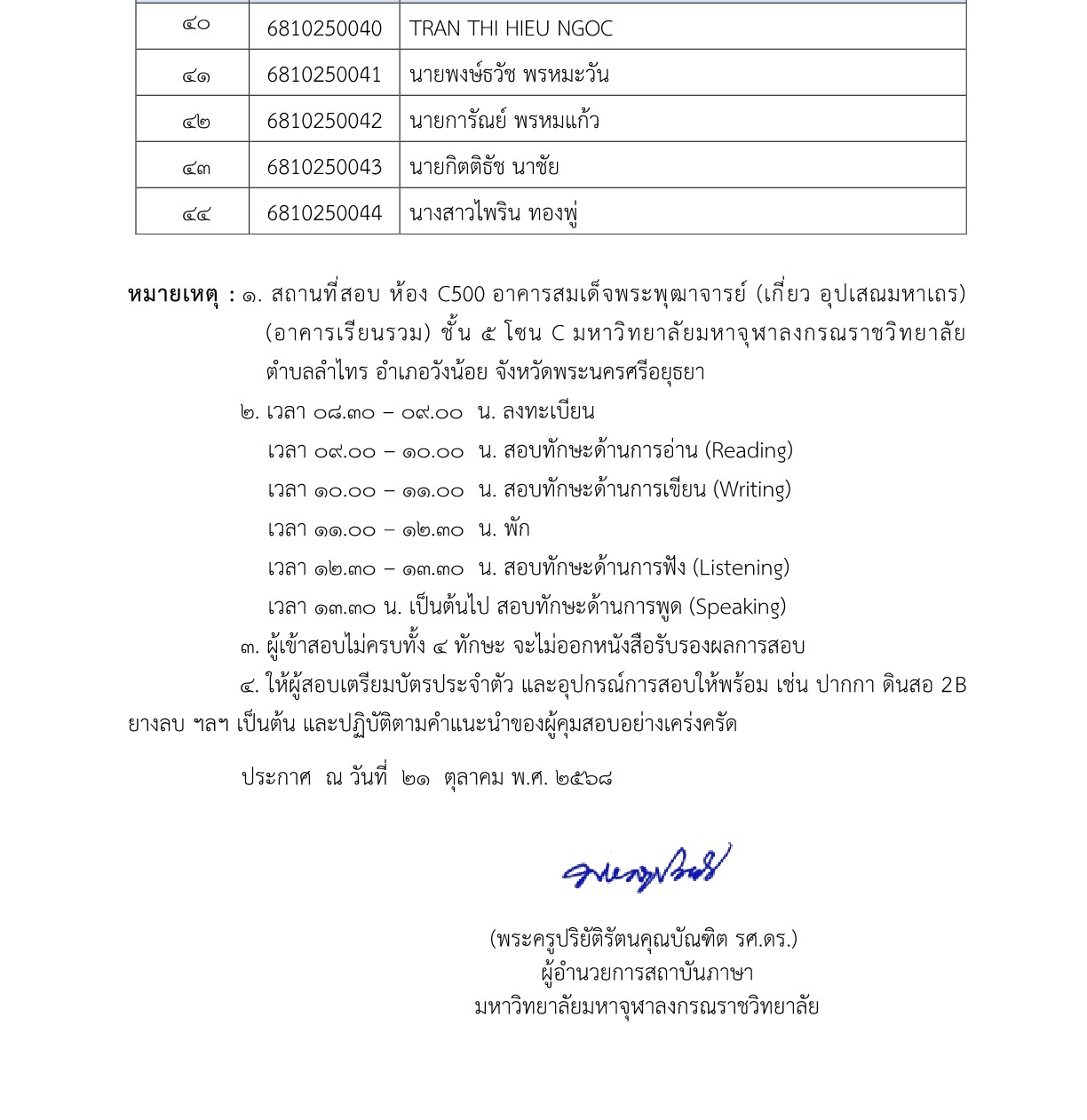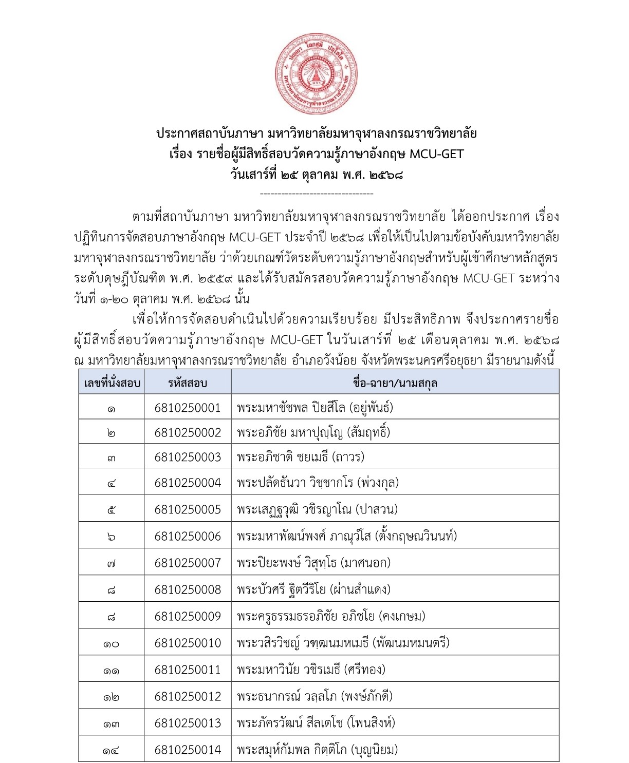 ประกาศรายชื่อผู้มีสิทธิ์สอบ MCU-GET ประจำเดือน ตุลาคม 2568