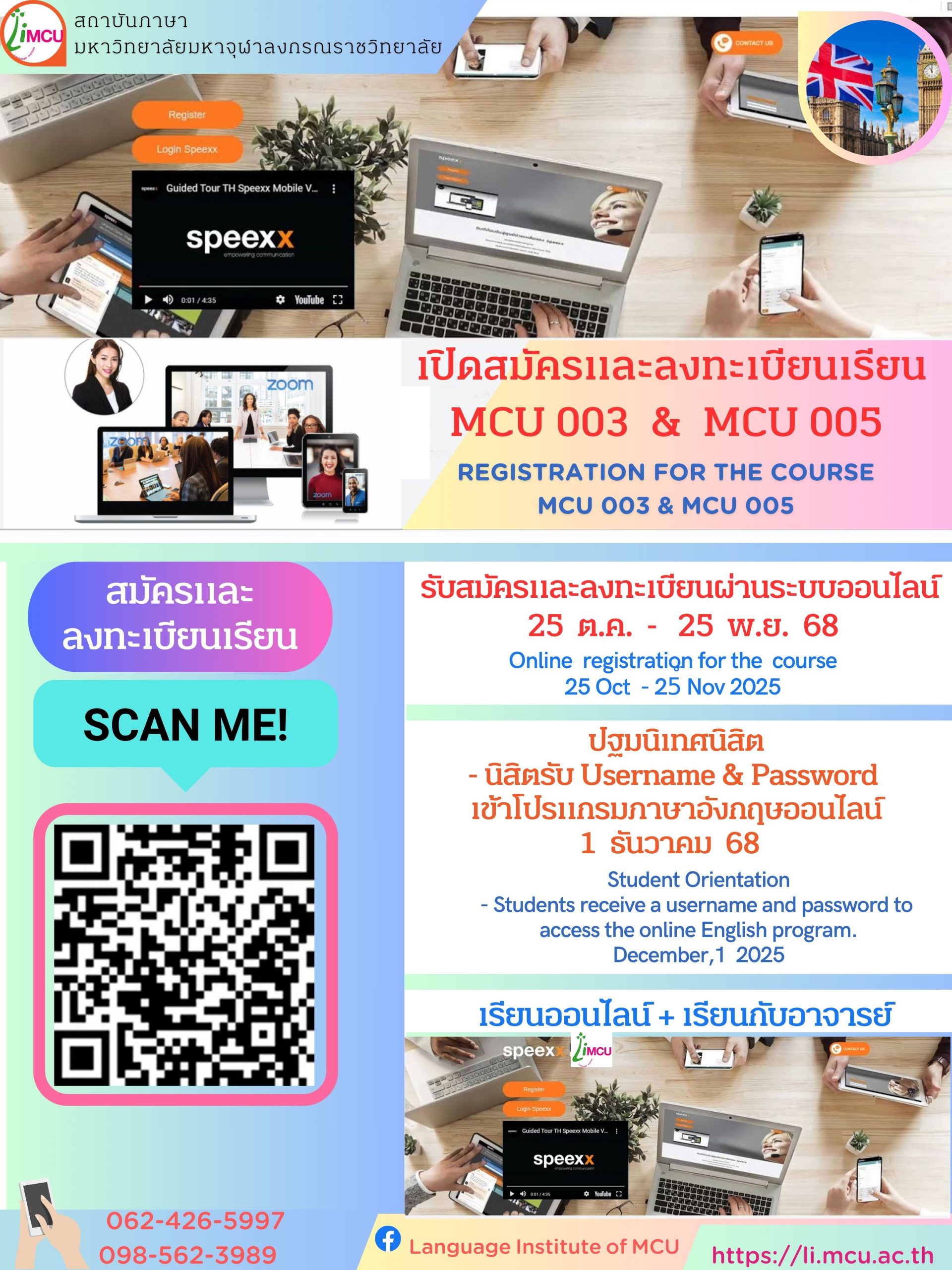 สถาบันภาษา เปิดสมัครและลงทะเบียน MCU 003 , MCU 005 ระหว่างวันที่ 25 ตุลาคม – 25 พฤศจิกายน 2568