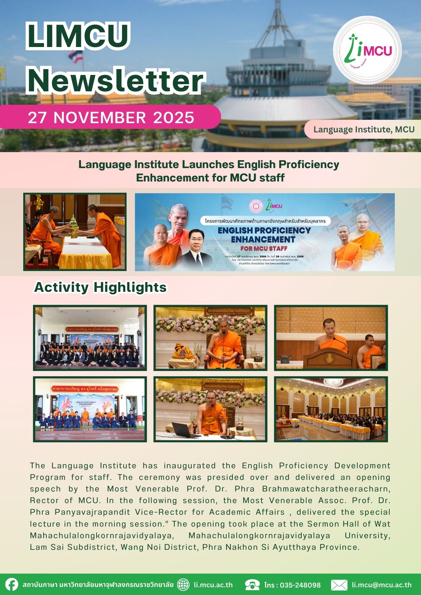 The Language Institute has inaugurated the English Proficiency Development Program for staff. The ceremony was presided over and delivered an opening speech by the Most Venerable Prof. Dr. Phra Brahmawatcharatheeracharn, Rector of MCU. In the following session, the Most Venerable Assoc. Prof. Dr. Phra Panyavajrapandit Vice-Rector for Academic Affairs , delivered the special lecture in the morning session.” The opening took place at the Sermon Hall of Wat Mahachulalongkornrajavidyalaya, Mahachulalongkornrajavidyalaya University, Lam Sai Subdistrict, Wang Noi District, Phra Nakhon Si Ayutthaya Province.