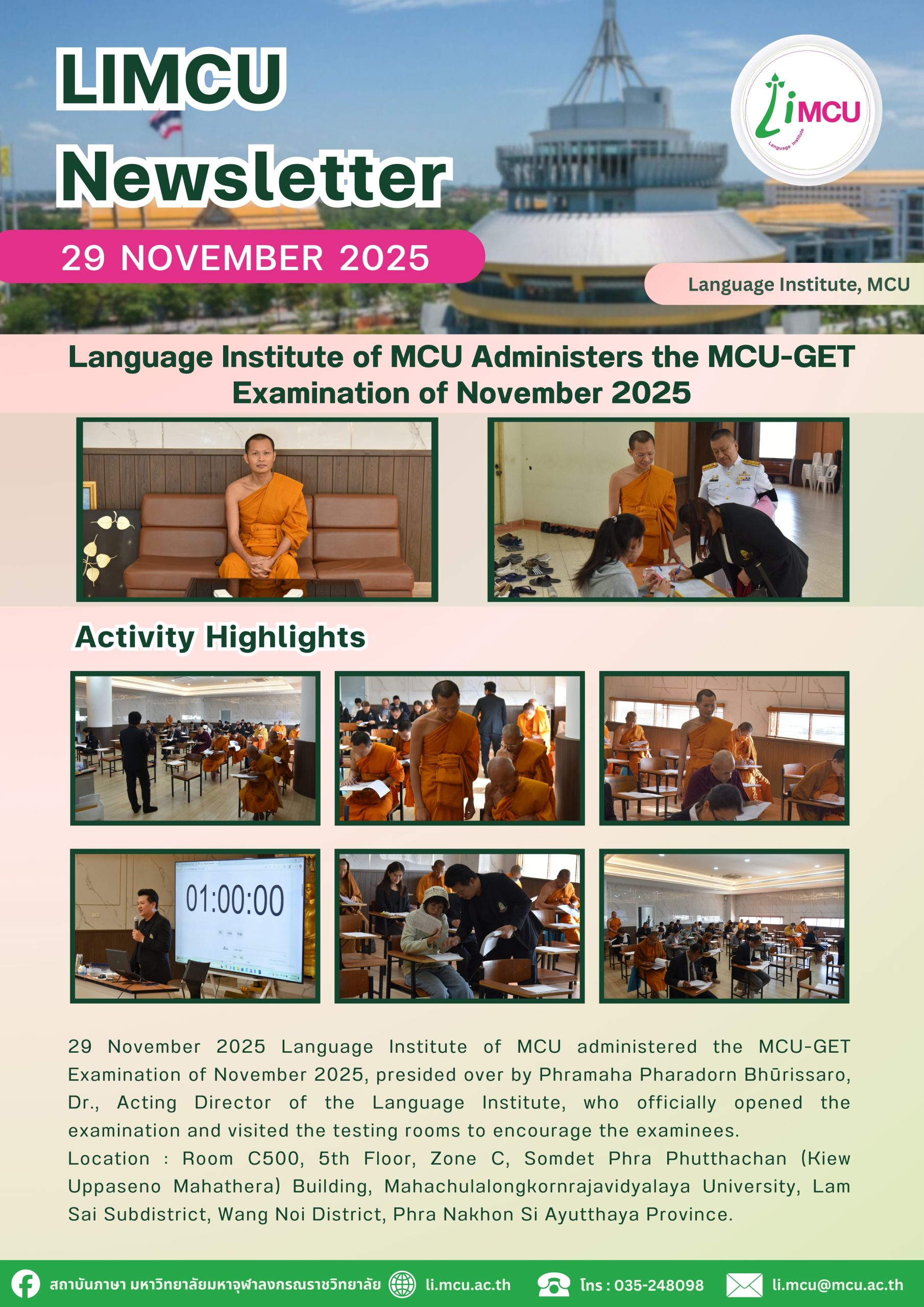 ๒๙ พฤศจิกายน ๒๕๖๘ สถาบันภาษาจัดสอบ MCU-GET ครั้งที่ ๑๑/๒๕๖๘ โดยมีพระมหาภราดร ภูริสฺสโร, ดร. รักษาการผู้อำนวยการสถาบันภาษา เป็นประธานเปิดสอบและตรวจเยี่ยมให้กำลังใจผู้เข้าสอบ ณ ห้องสอบ C500 ชั้น 5 โซน C อาคารสมเด็จพระพุฒาจารย์ (เกี่ยว อุปเสณมหาเถร) มหาวิทยาลัยมหาจุฬาลงกรณราชวิทยาลัย ต.ลำไทร อ.วังน้อย จ.พระนครศรีอยุธยา