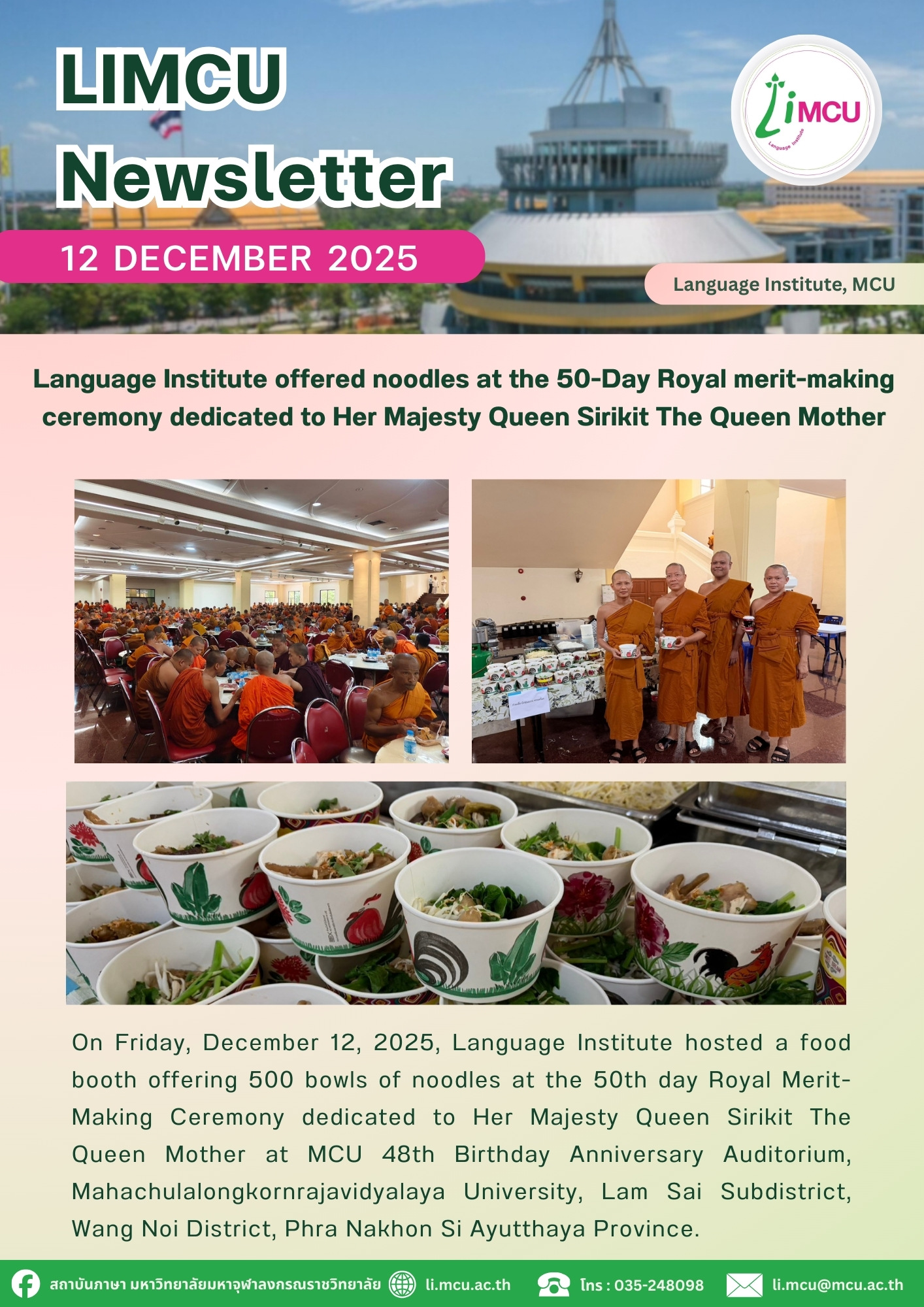 On Friday, December 12, 2025, Language Institute hosted a food booth offering 500 bowls of noodles at the 50th day Royal Merit-Making Ceremony dedicated to Her Majesty Queen Sirikit The Queen Mother at MCU 48th Birthday Anniversary Auditorium, Mahachulalongkornrajavidyalaya University, Lam Sai Subdistrict, Wang Noi District, Phra Nakhon Si Ayutthaya Province.