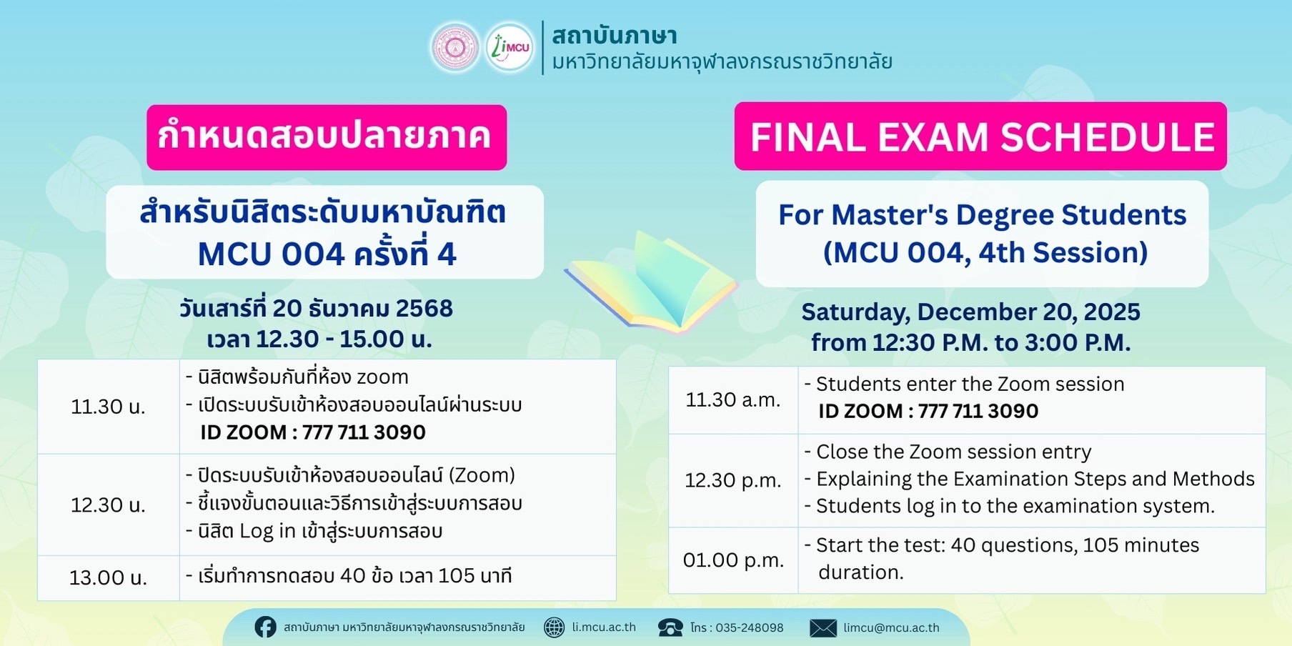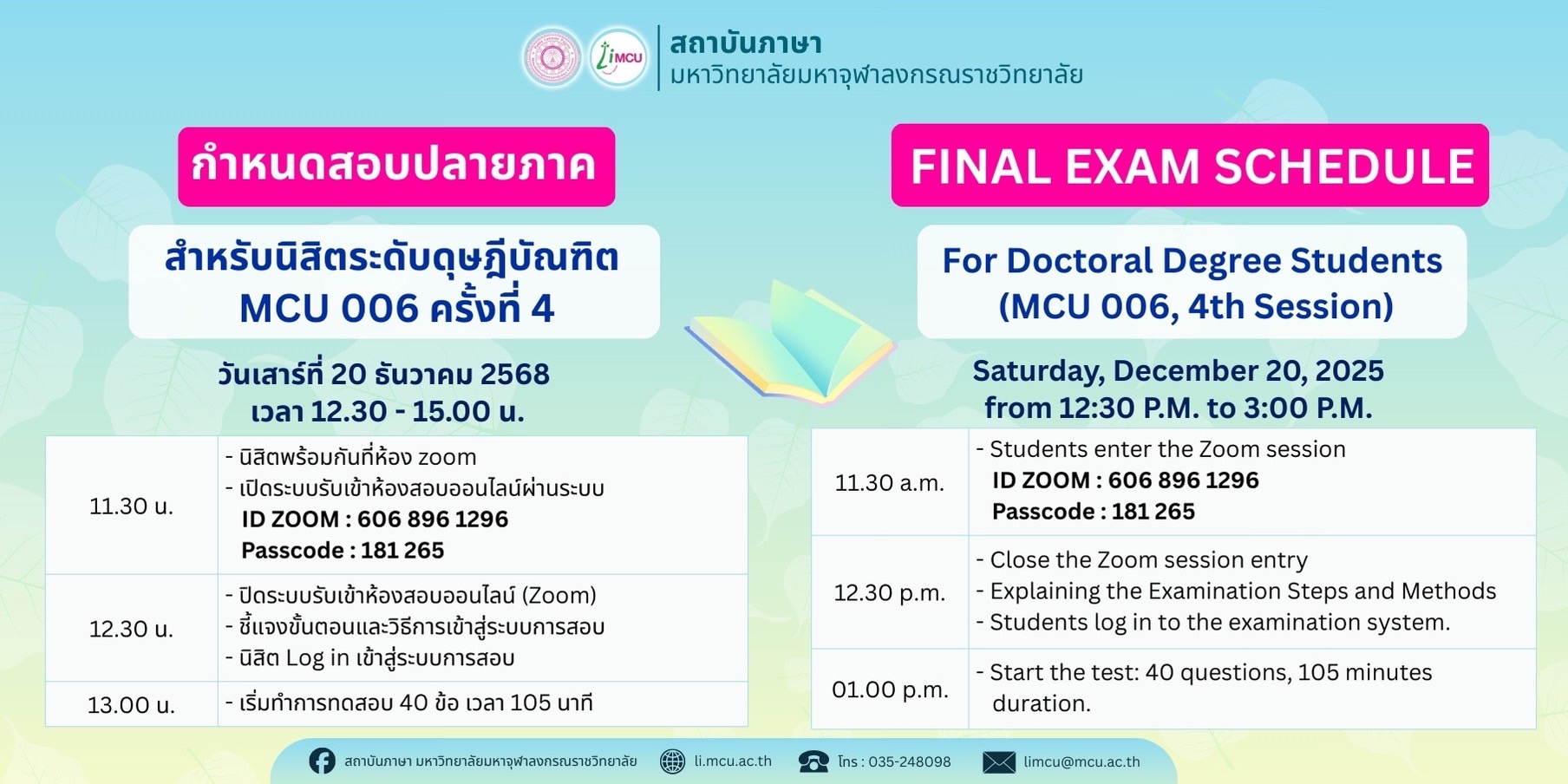 สถาบันภาษา มหาวิทยาลัยมหาจุฬาลงกรณราชวิทยาลัย จัดสอบภาษาอังกฤษ final exam สถาบันภาษา จัดสอบภาษาอังกฤษ final exam mcu 004 สำหรับนิสิตระดับปริญญาโท และ MCU 006 สำหรับนิสิตระดับปริญญาเอก ที่ลงเรียนภาษาอังกฤษ ครั้งที่ ๔ กับสถาบันภาษา