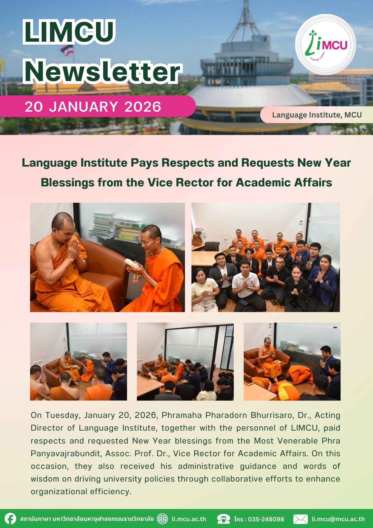On Tuesday, January 20, 2026, Phramaha Pharadorn Bhurrisaro, Dr., Acting Director of Language Institute, together with the personnel of LIMCU, paid respects and requested New Year blessings from the Most Venerable Phra Panyavajrabundit, Assoc. Prof. Dr., Vice Rector for Academic Affairs. On this occasion, they also received his administrative guidance and words of wisdom on driving university policies through collaborative efforts to enhance organizational efficiency.