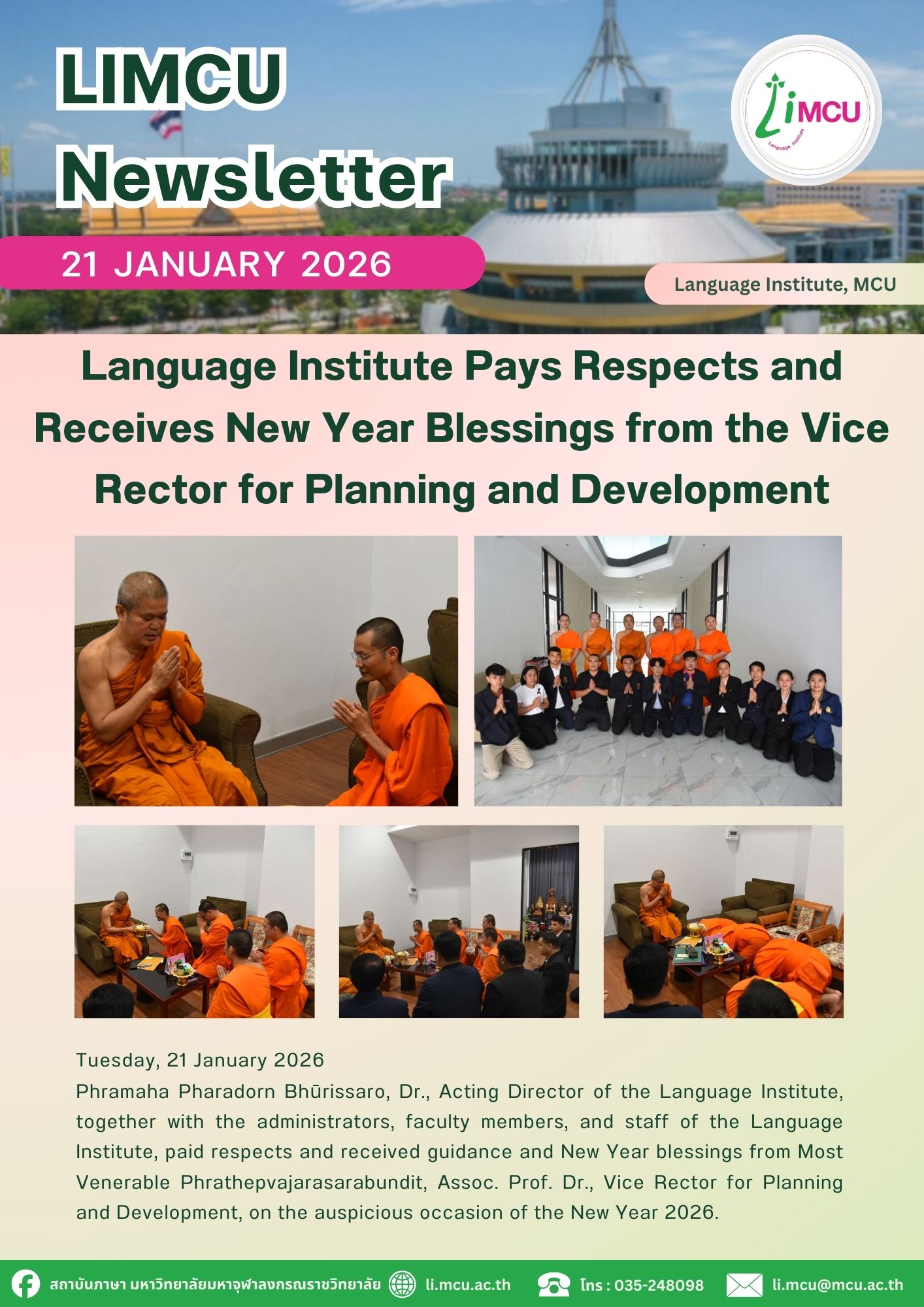 Phramaha Pharadorn Bhūrissaro, Dr., Acting Director of the Language Institute, together with the administrators, faculty members, and staff of the Language Institute, paid respects and received guidance and New Year blessings from Most Venerable Phrathepvajarasarabundit, Assoc. Prof. Dr., Vice Rector for Planning and Development, on the auspicious occasion of the New Year 2026.