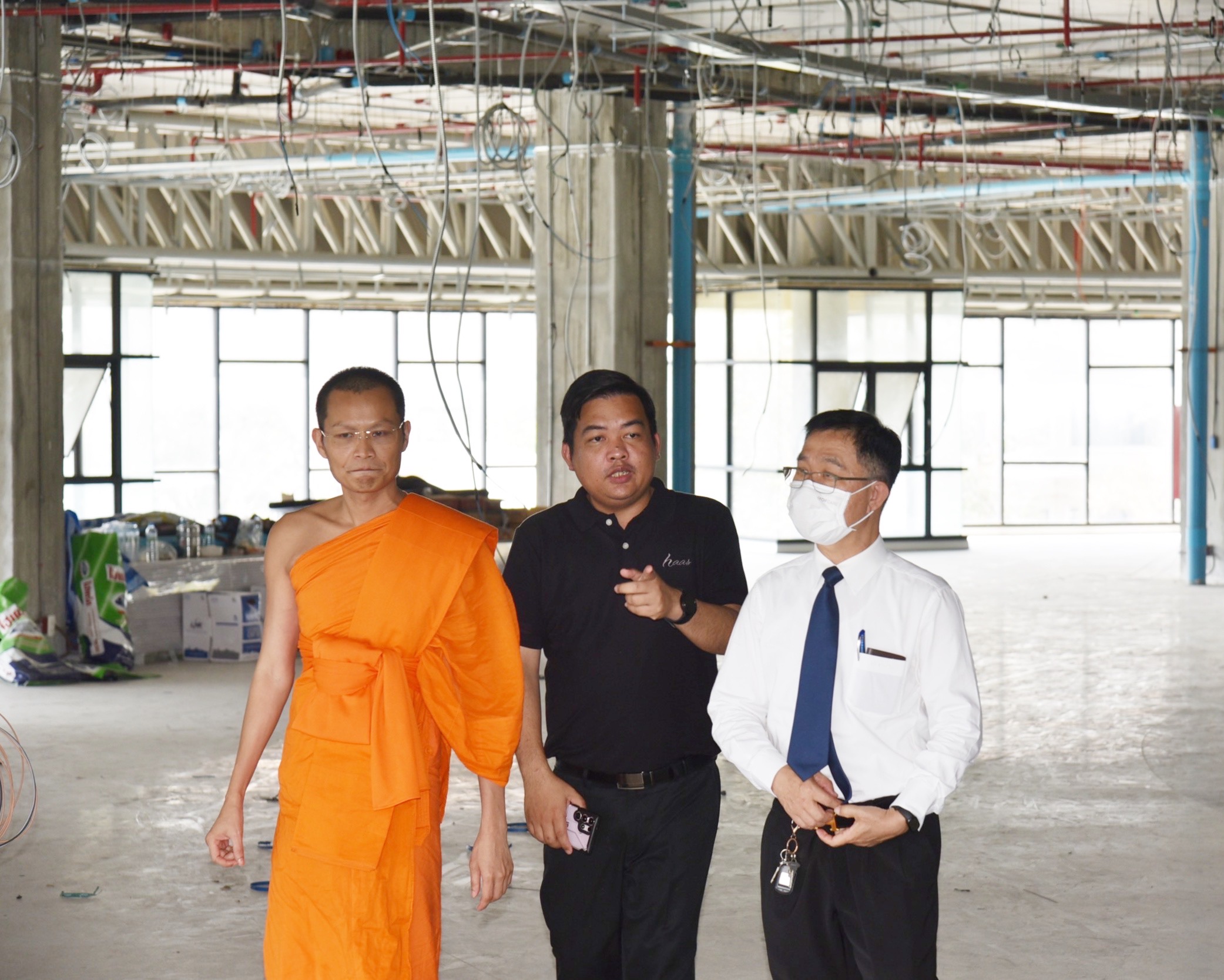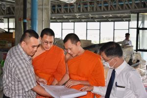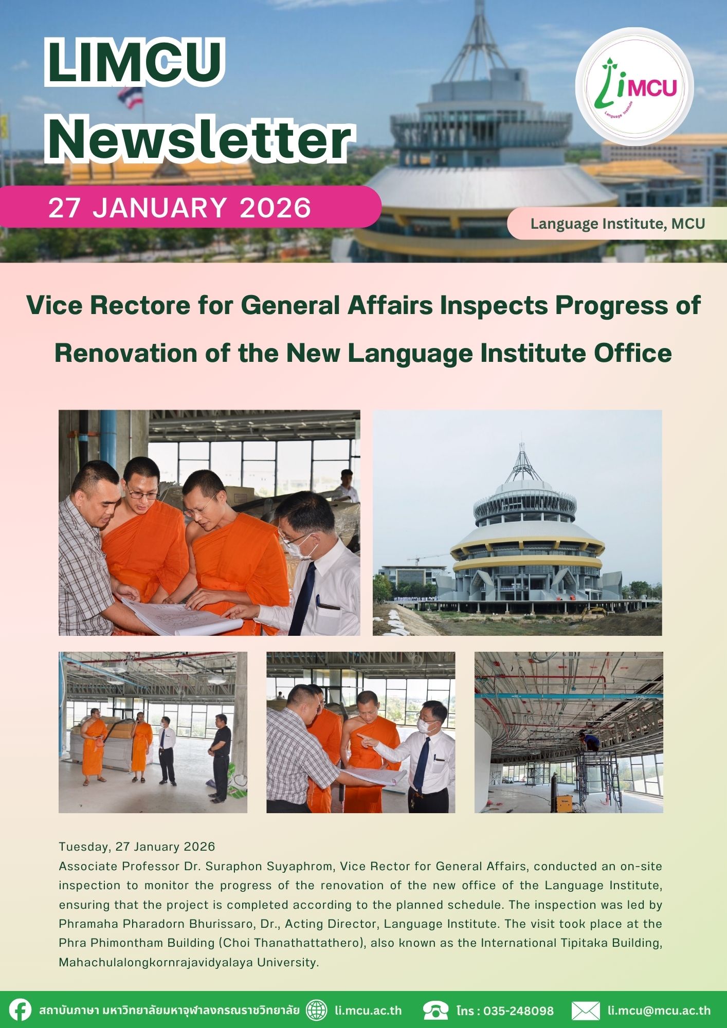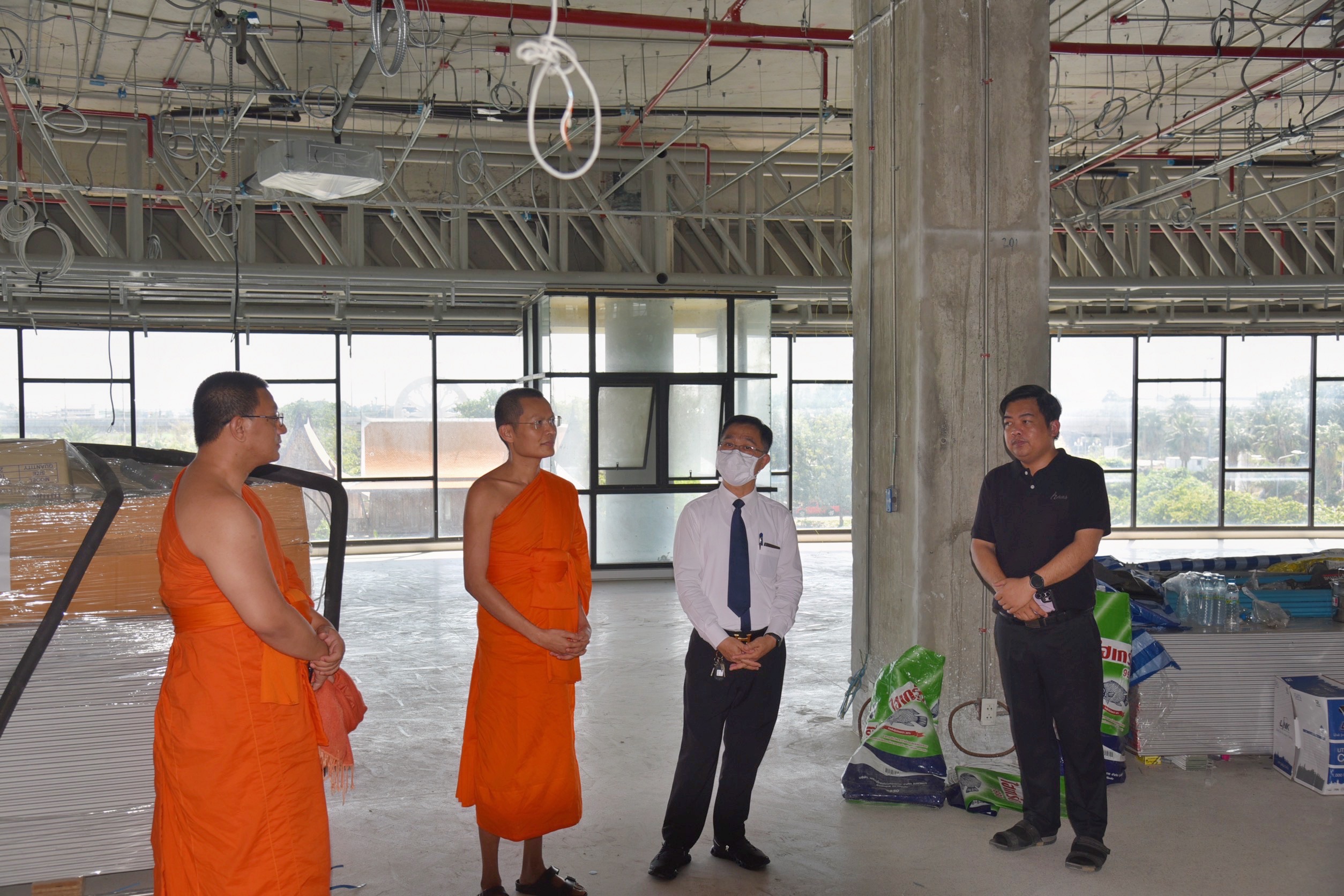 Associate Professor Dr. Suraphon Suyaphrom, Vice Rector for General Affairs, conducted an on-site inspection to monitor the progress of the renovation of the new office of the Language Institute, ensuring that the project is completed according to the planned schedule. The inspection was led by Phramaha Pharadorn Bhurissaro, Dr., Acting Director, Language Institute.