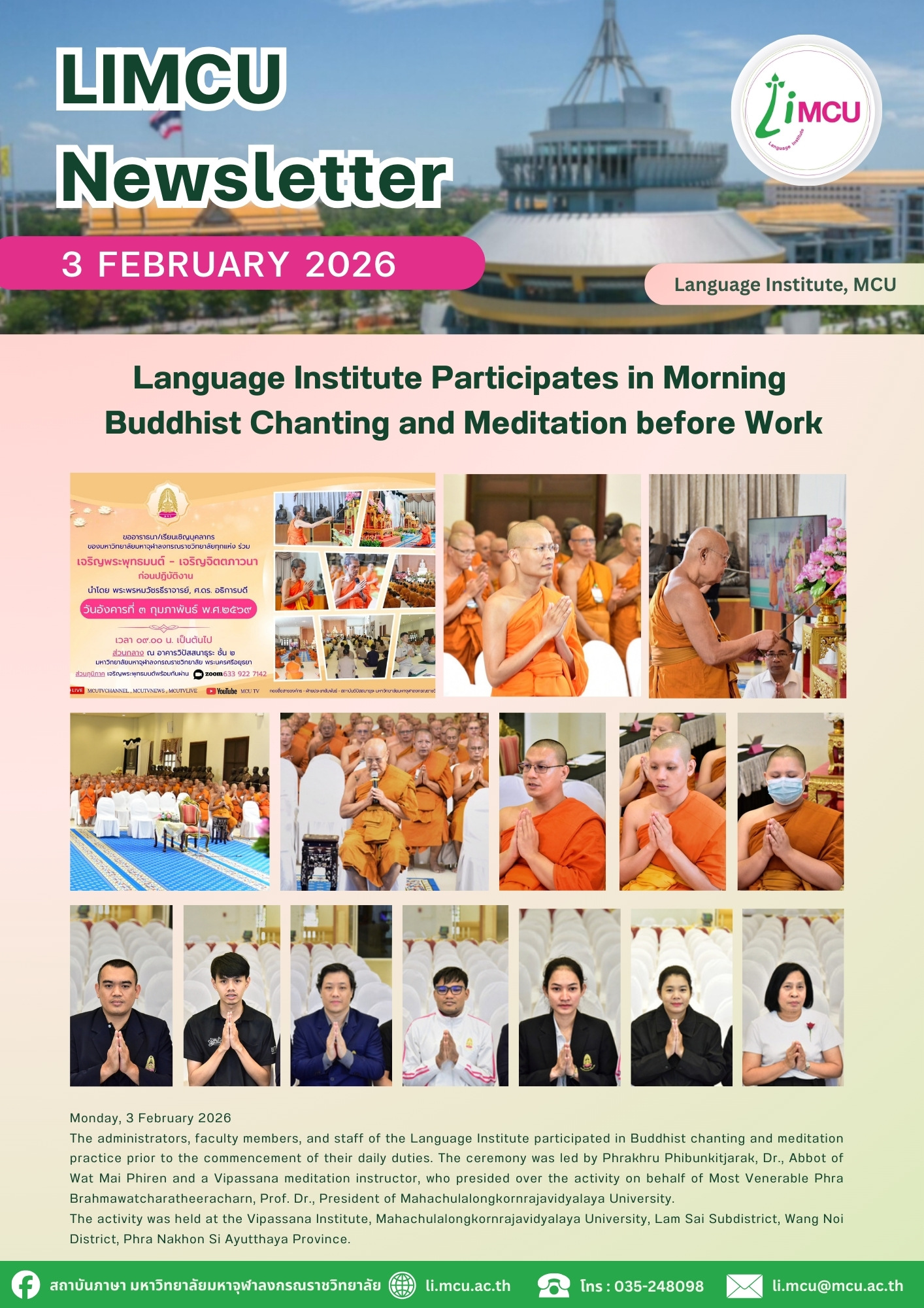 The administrators, faculty members, and staff of the Language Institute participated in Buddhist chanting and meditation practice prior to the commencement of their daily duties. The ceremony was led by Phrakhru Phibunkitjarak, Dr., Abbot of Wat Mai Phiren and a Vipassana meditation instructor, who presided over the activity on behalf of Most Venerable Phra Brahmawatcharatheeracharn, Prof. Dr., President of Mahachulalongkornrajavidyalaya University.The activity was held at the Vipassana Institute, Mahachulalongkornrajavidyalaya University, Lam Sai Subdistrict, Wang Noi District, Phra Nakhon Si Ayutthaya Province.