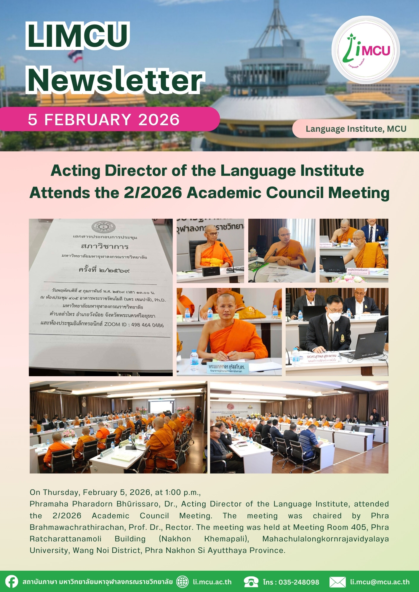 Phramaha Pharadorn Bhūrissaro, Dr., Acting Director of the Language Institute, attended the 2/2026 Academic Council Meeting. The meeting was chaired by Phra Brahmawachrathirachan, Prof. Dr., Rector. The meeting was held at Meeting Room 405, Phra Ratcharattanamoli Building (Nakhon Khemapali), Mahachulalongkornrajavidyalaya University, Wang Noi District, Phra Nakhon Si Ayutthaya Province.