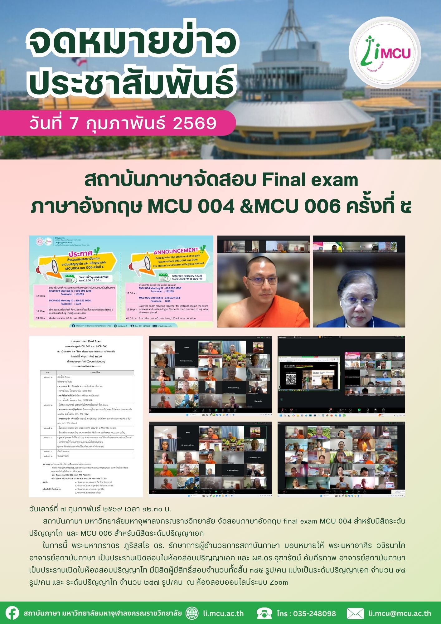 สถาบันภาษา มหาวิทยาลัยมหาจุฬาลงกรณราชวิทยาลัย จัดสอบภาษาอังกฤษ final exam MCU 004 สำหรับนิสิตระดับปริญญาโท และ MCU 006 สำหรับนิสิตระดับปริญญาเอก