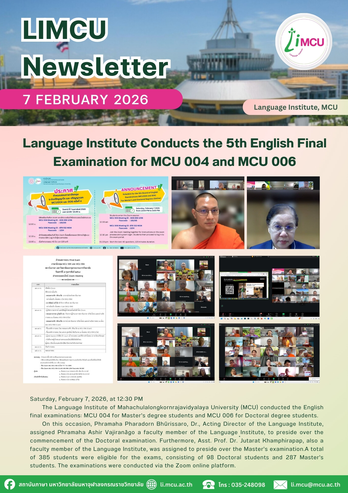 The Language Institute of Mahachulalongkornrajavidyalaya University (MCU) conducted the English final examinations: MCU 004 for Master’s degree students and MCU 006 for Doctoral degree students.