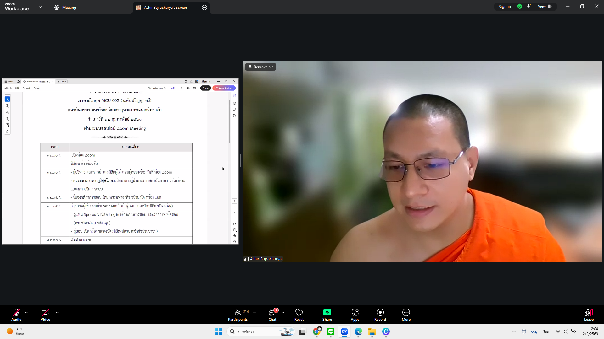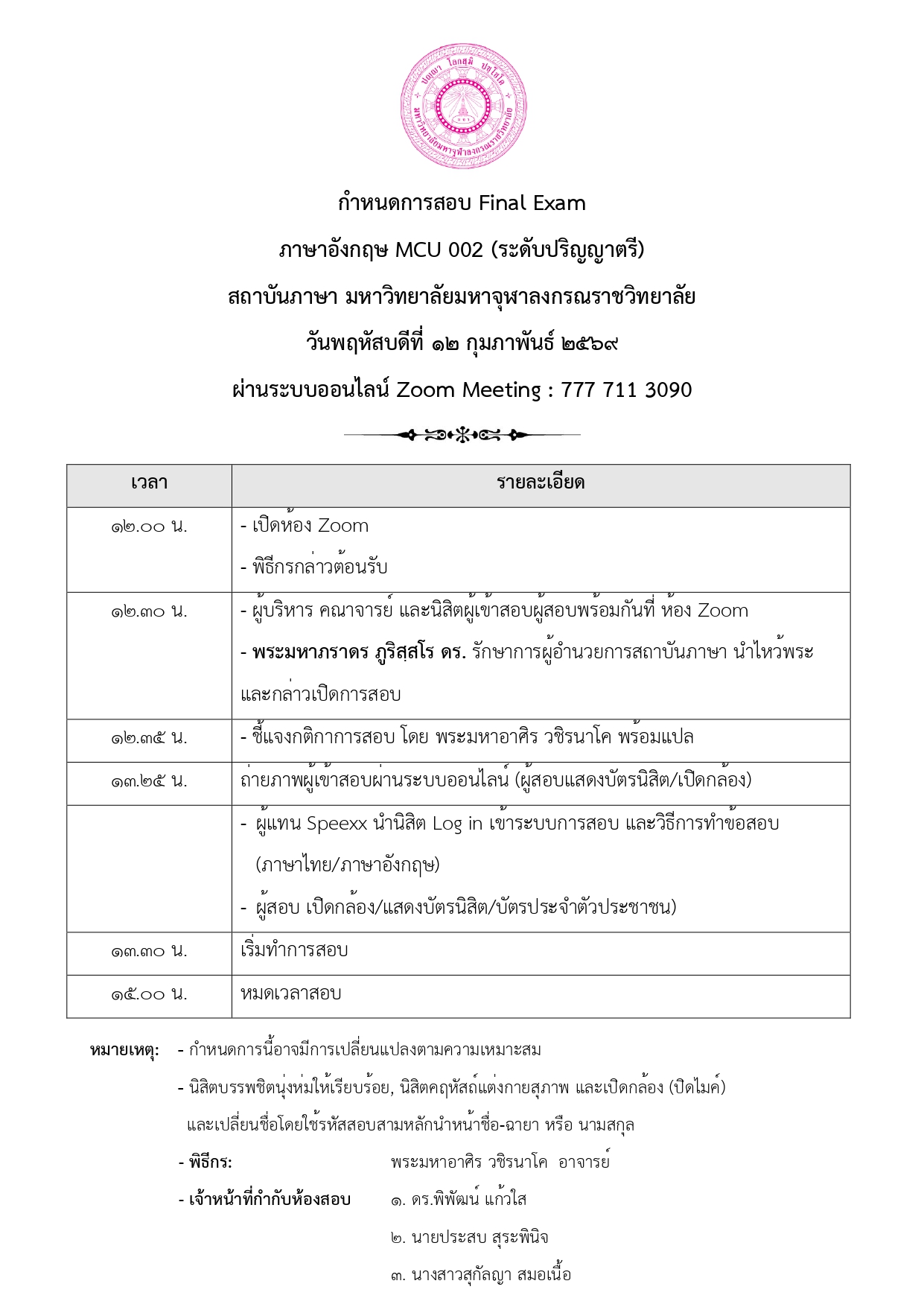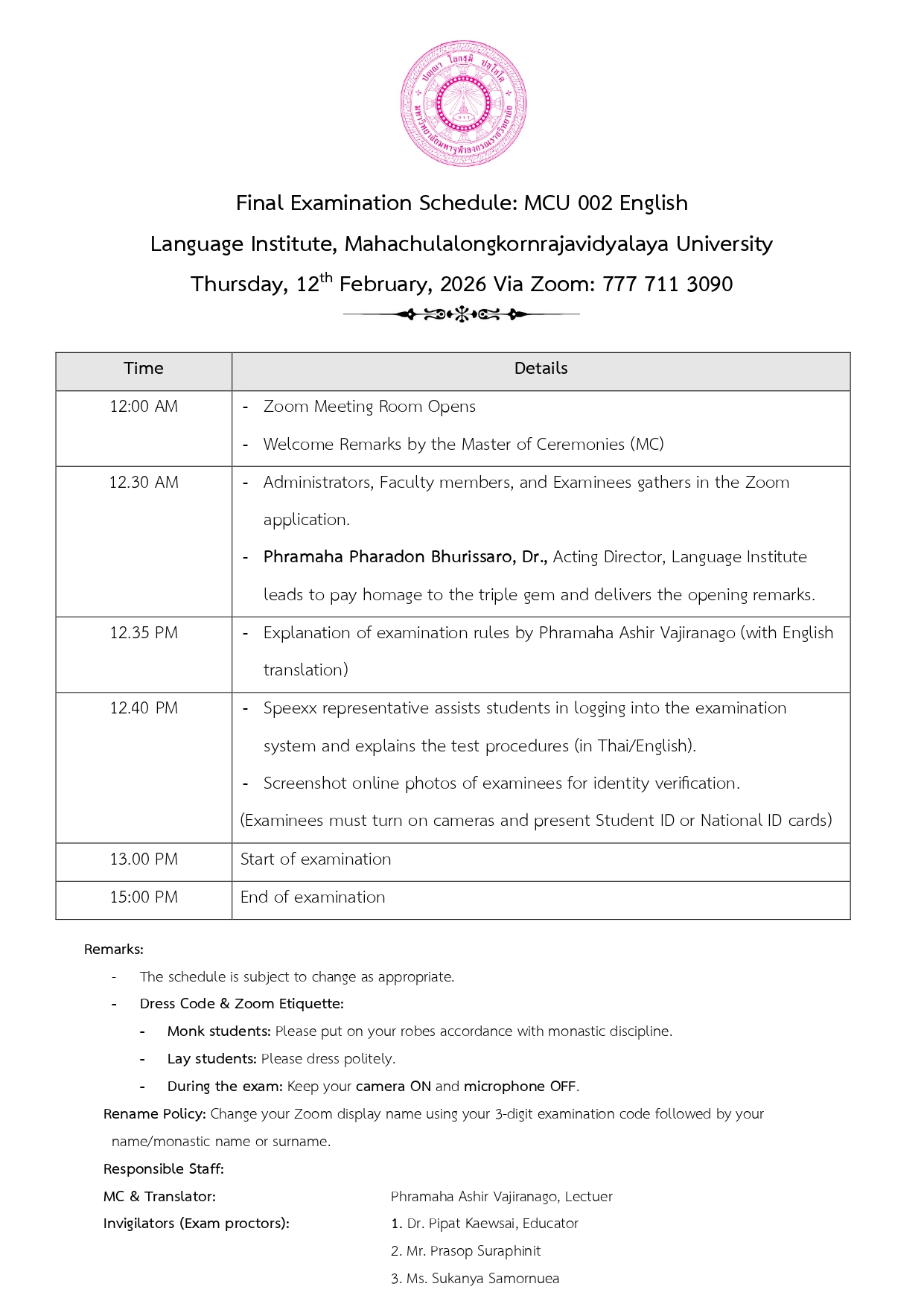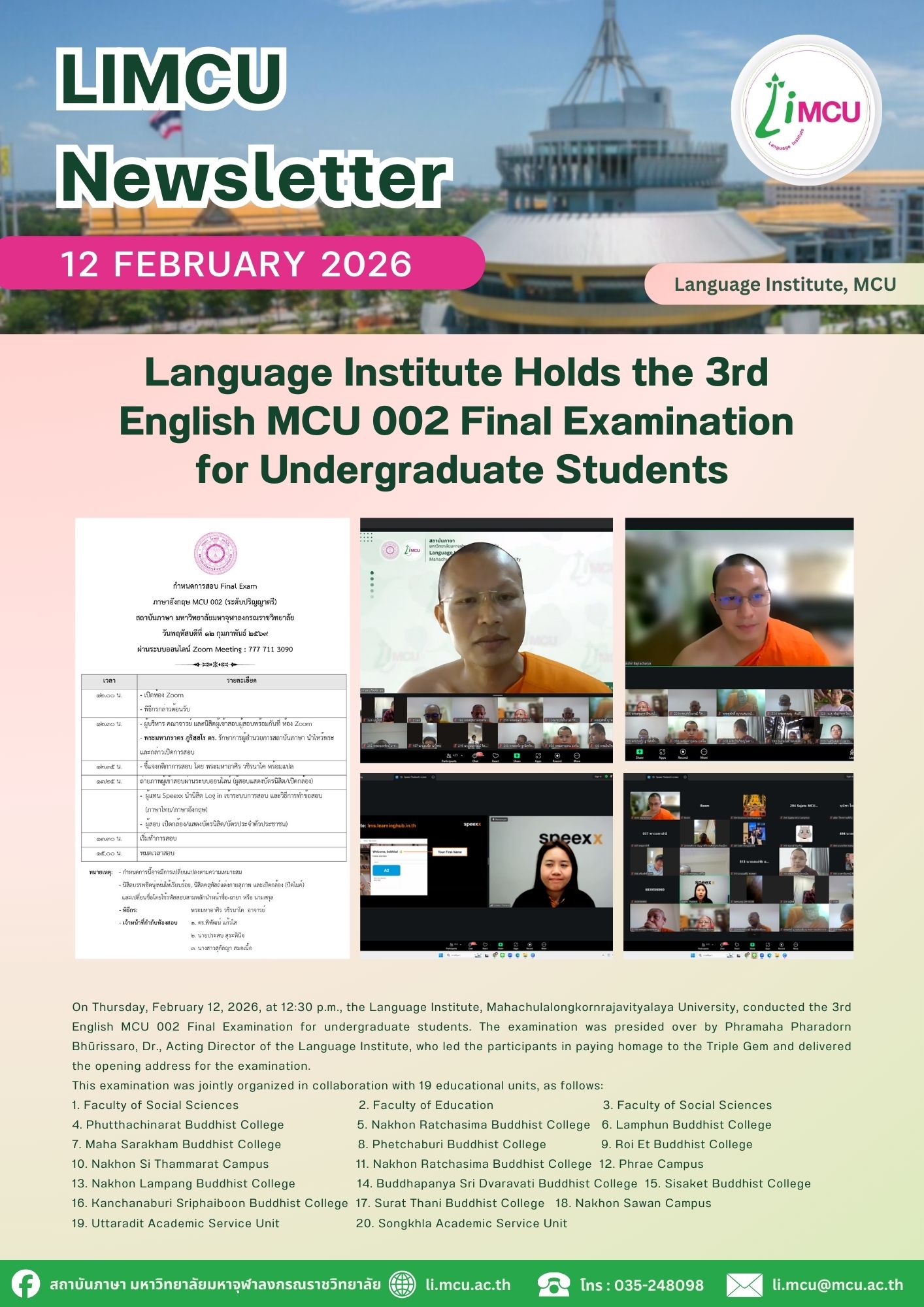 On Thursday, February 12, 2026, at 12:30 p.m., the Language Institute, Mahachulalongkornrajavidyalaya University, conducted the 3rd English MCU 002 Final Examination for undergraduate students. The examination was presided over by Phramaha Pharadorn Bhūrissaro, Dr., Acting Director of the Language Institute, who led the participants in paying homage to the Triple Gem and delivered the opening address for the examination.