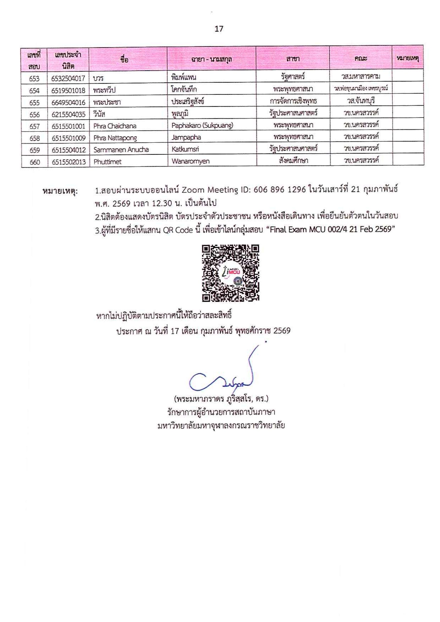 2. สอบผ่านระบบออนไลน์ Zoom Meeting ID: 606 896 1296 ในวันเสาร์ที่ 21 กุมภาพันธ์ พ.ศ. 2569 เวลา 12.30 น. เป็นต้นไป