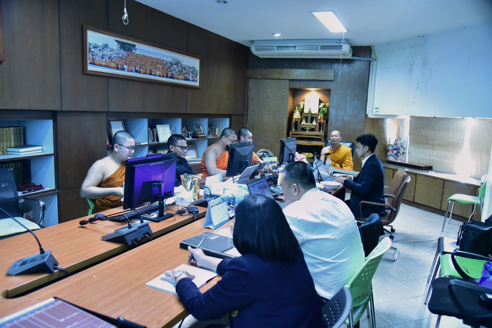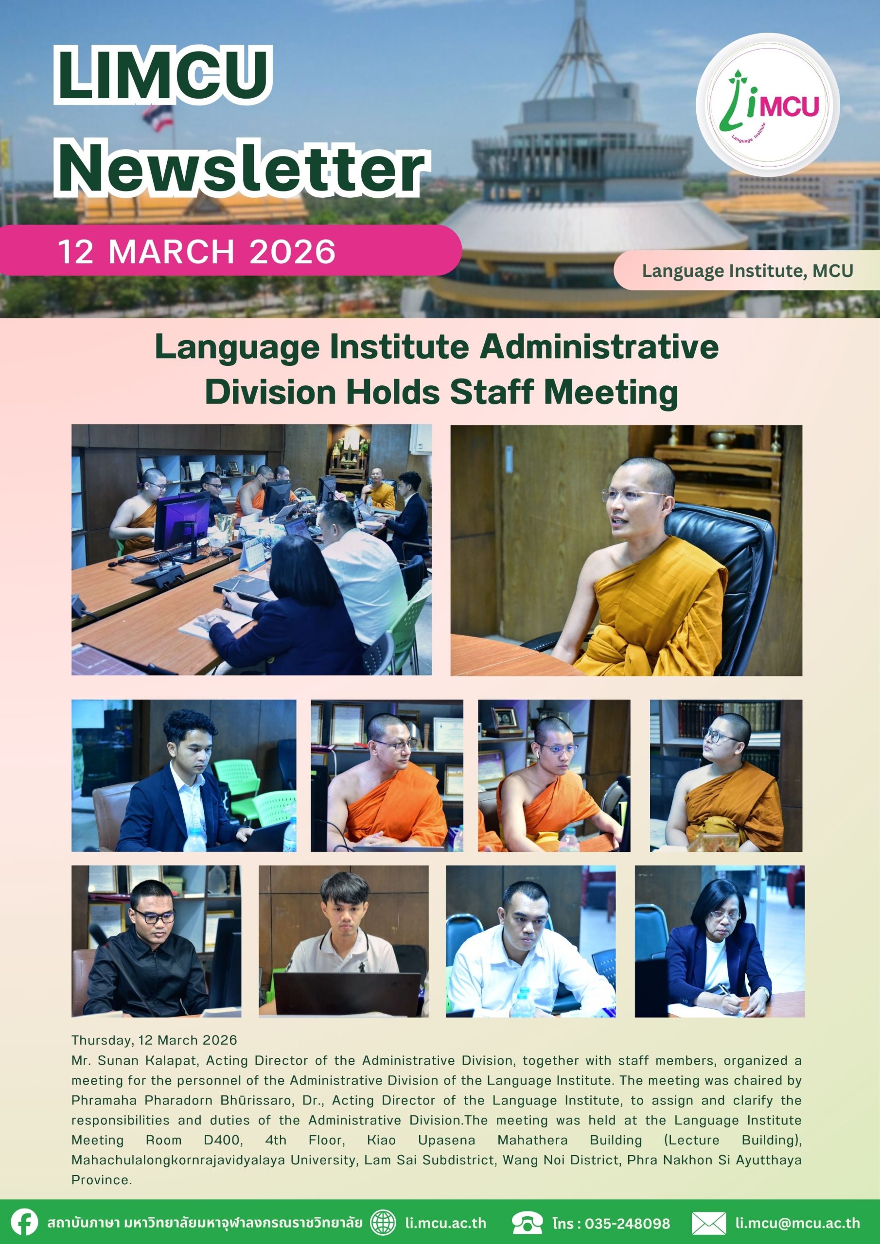 นายสุนันท์ กาละพัฒน์ รักษาการผู้อำนวยการส่วนงานบริหารและเจ้าหน้าที่ จัดประชุมบุคลากรประจำส่วนงานบริหาร สถาบันภาษา โดยมี พระมหาภราดร ภูริสฺสโร, ดร. รักษาการผู้อำนวยการสถาบันภาษา เป็นประธาน แบ่งภาระหน้าที่การปฏิบัติงานของส่วนงานบริหาร ณ ห้องประชุมสถาบันภาษา D400 ชั้น ๔ อาคารเรียนรวม (เกี่ยว อุปเสณมหาเถร) มหาวิทยาลัยมหาจุฬาลงกรณราชวิทยาลัย ตำบลลำไทร อำเภอวังน้อย จังหวัดพระนครศรีอยุธยา
