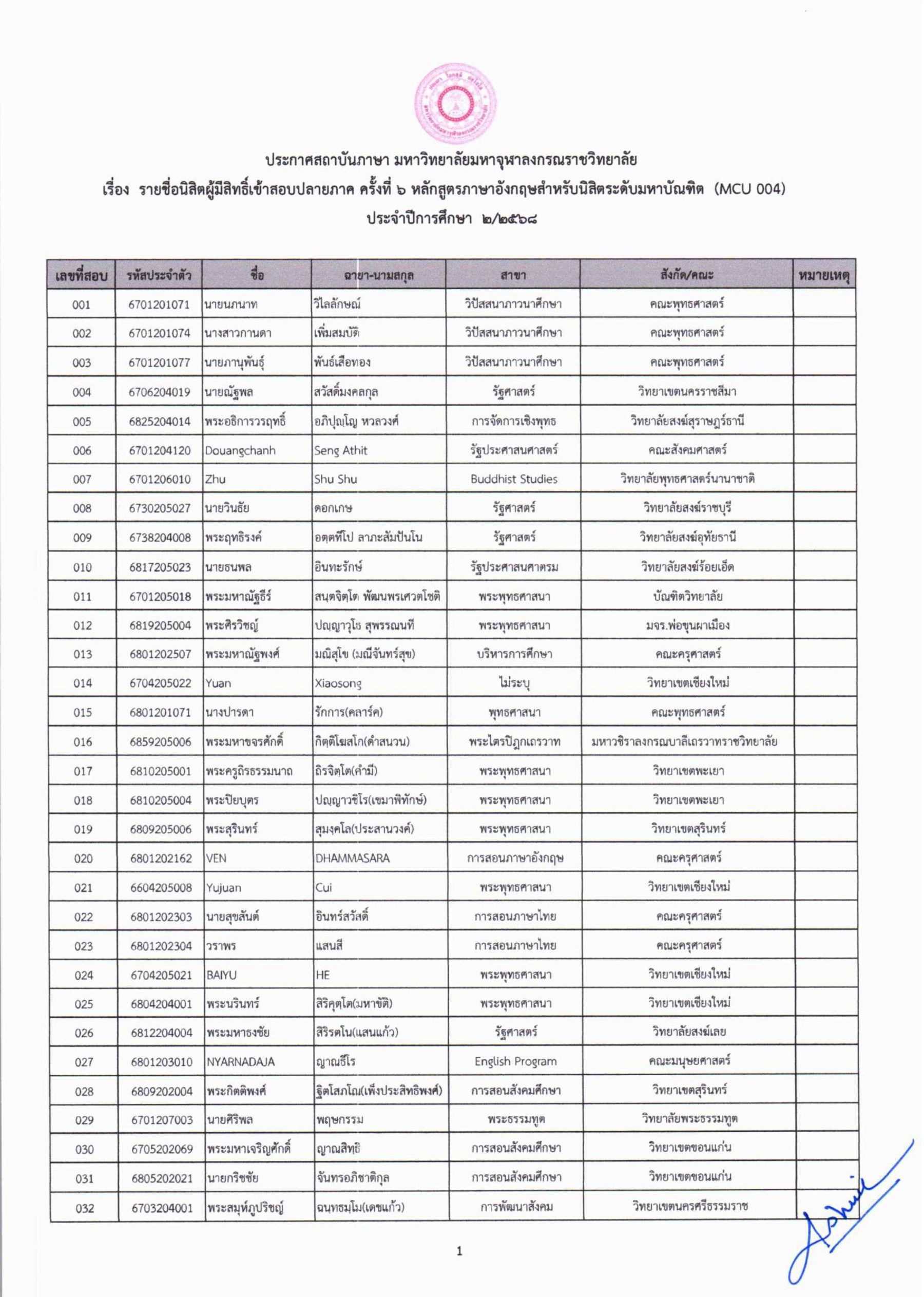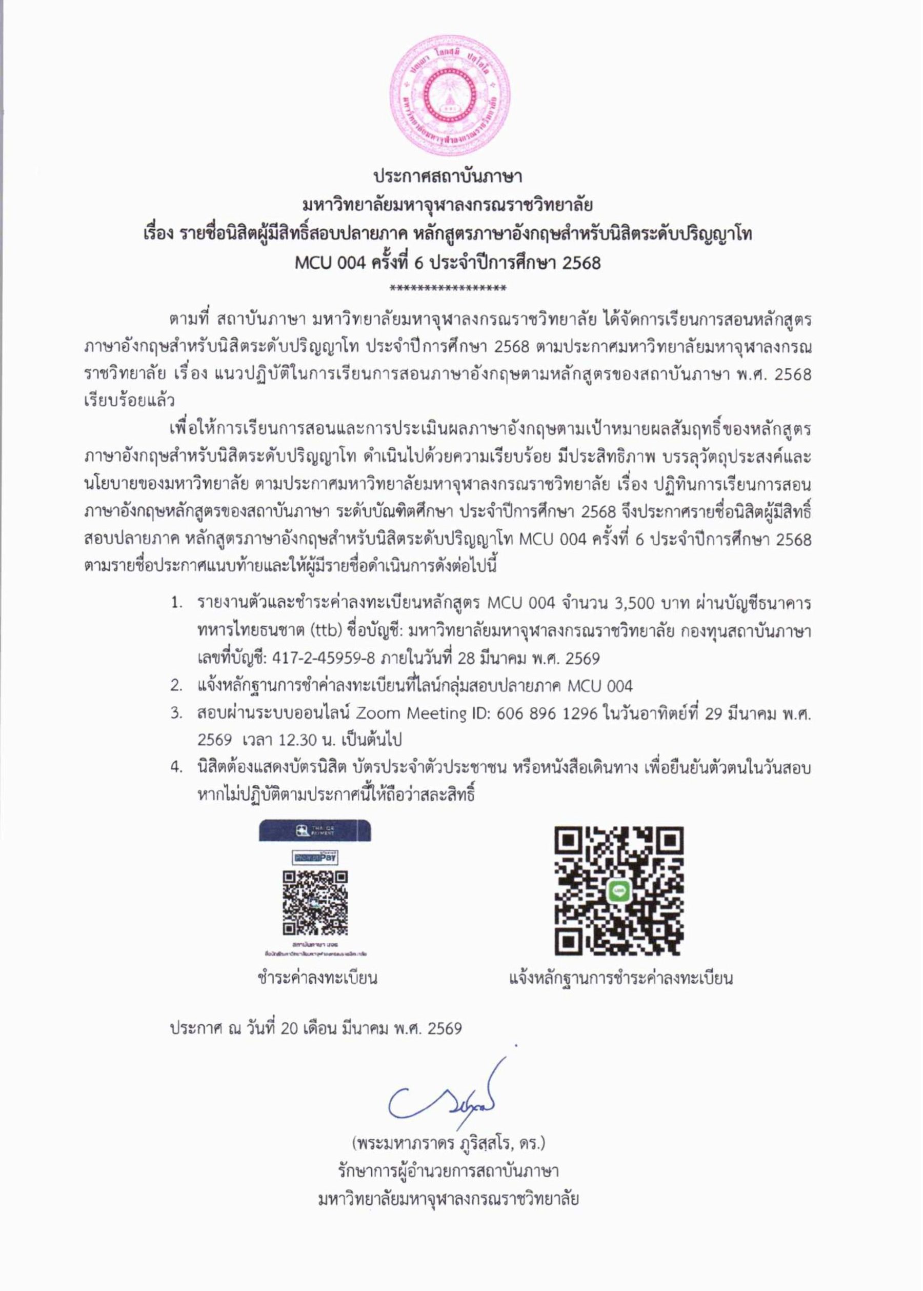 รายชื่อนิสิตผู้มีสิทธิ์สอบปลายภาค หลักสูตรภาษาอังกฤษสำหรับนิสิตระดับปริญญาโท MCU 004 ครั้งที่ 6 ประจำปีการศึกษา 2568