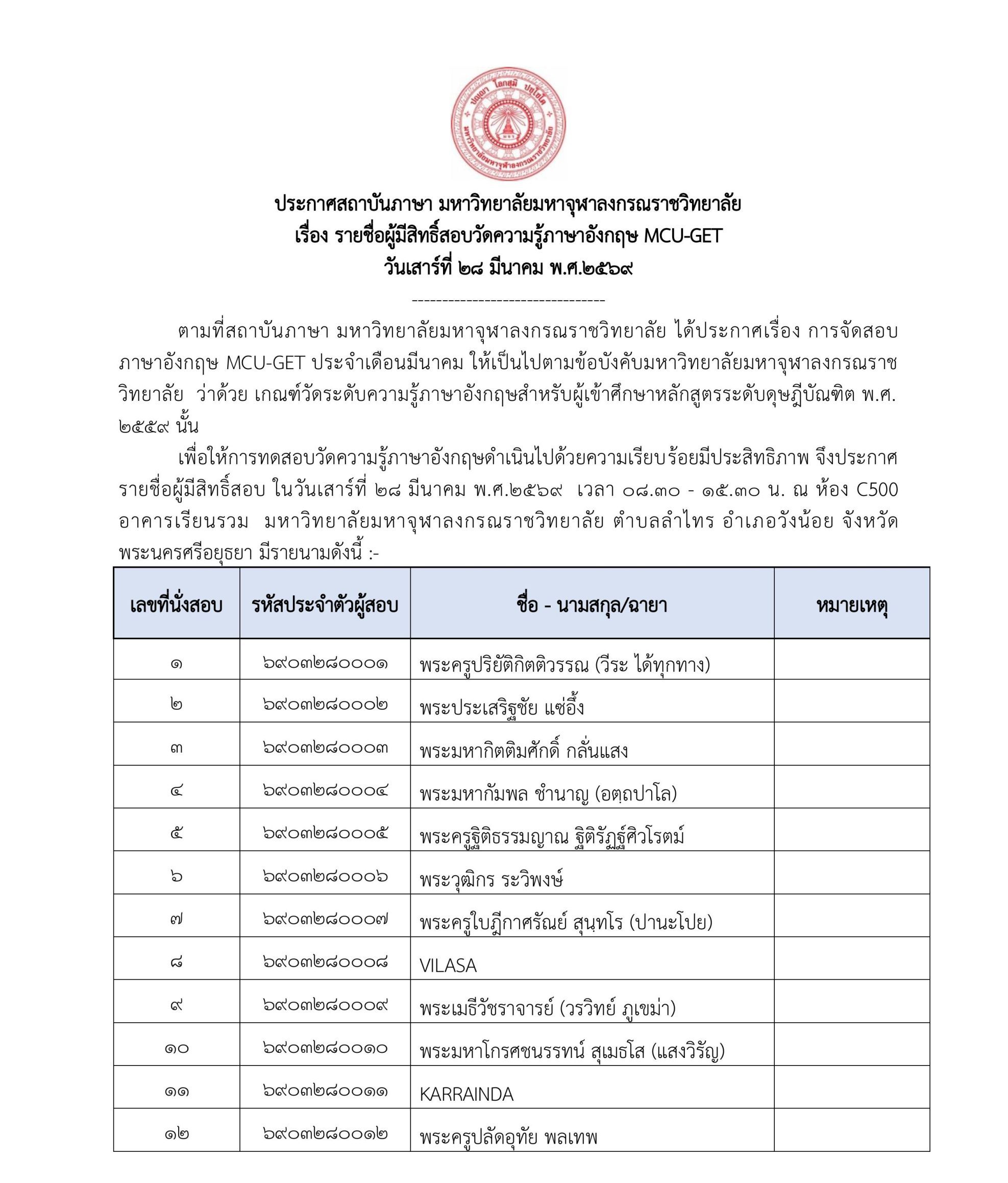 Announcement: List of Eligible Candidates for the MCU-GET English Proficiency Test Session 3/2026 â March 2026