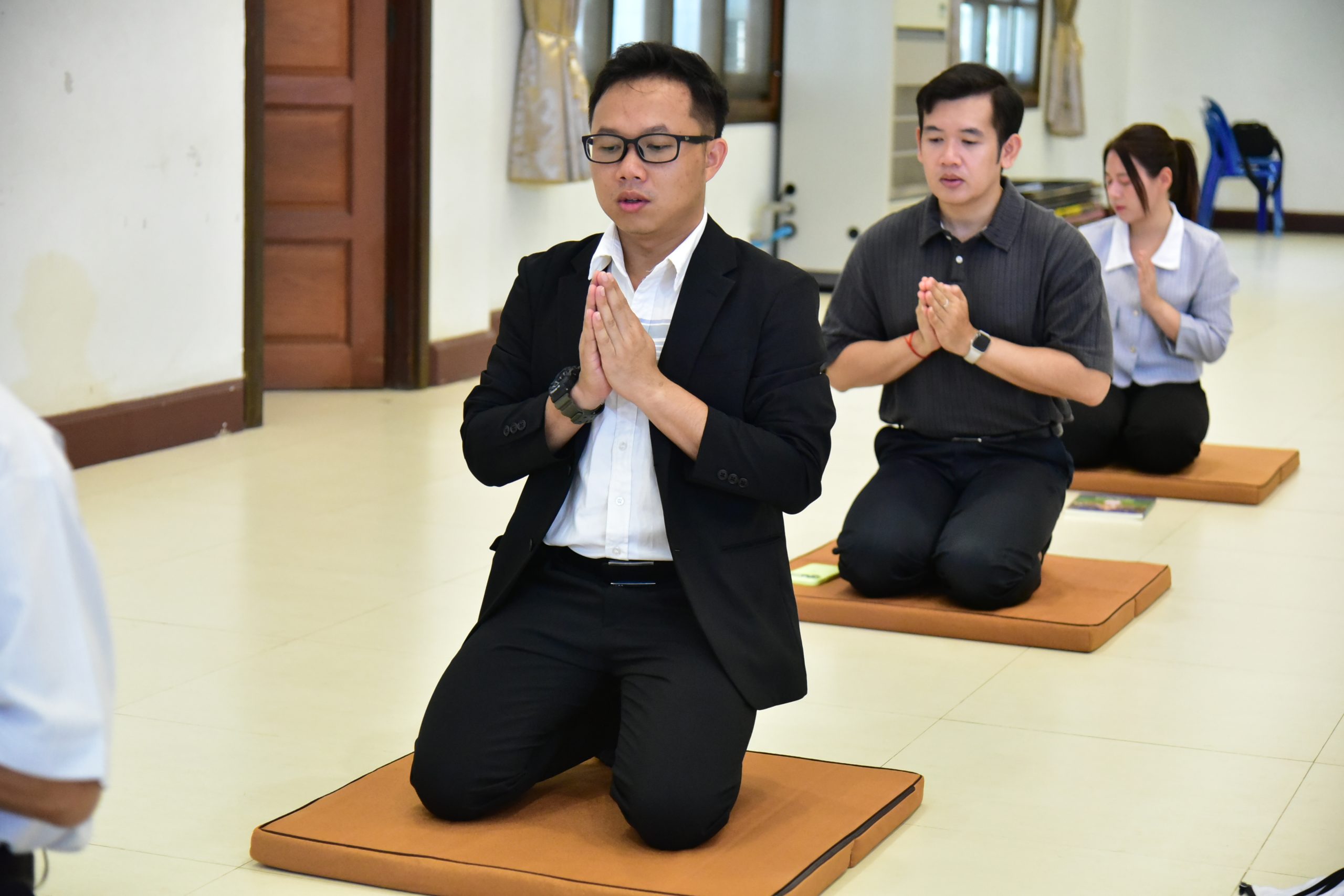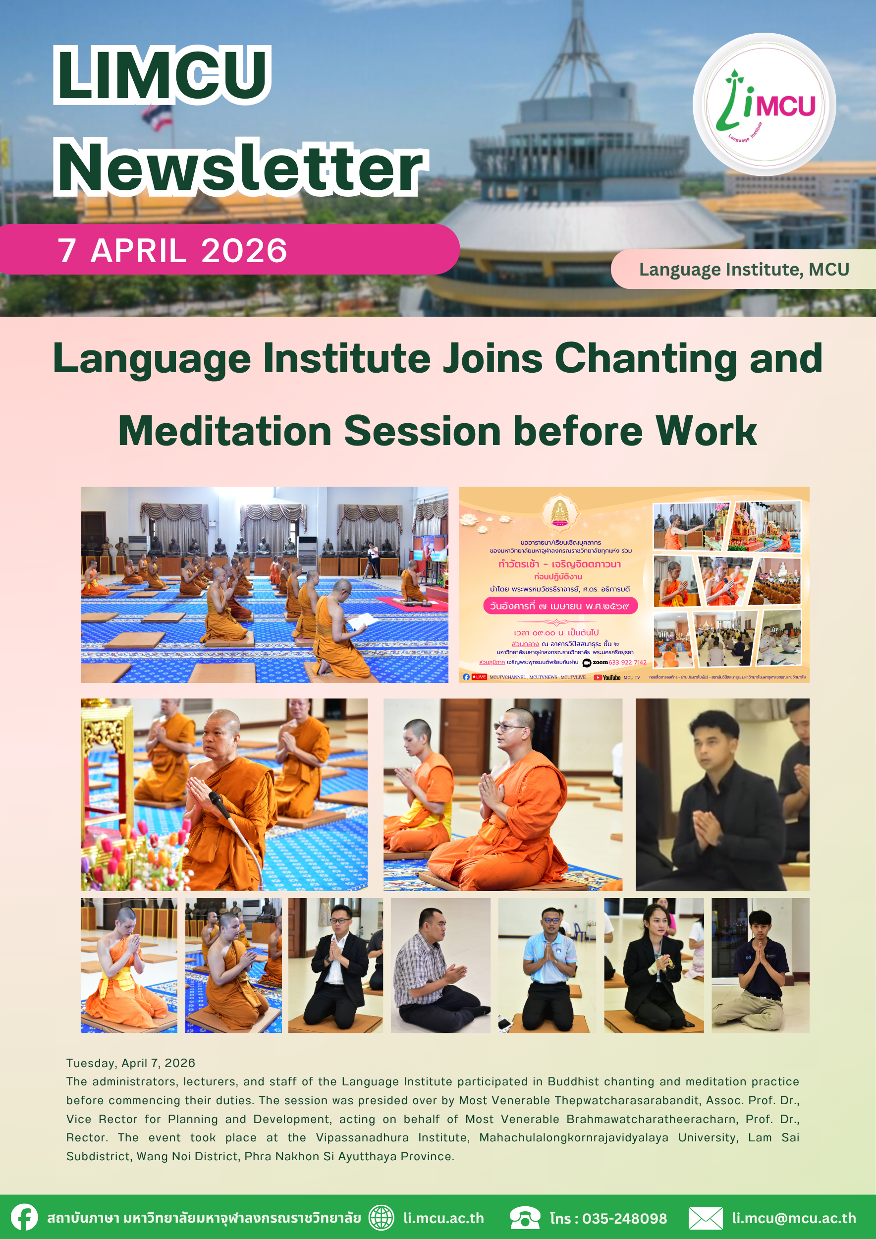 The administrators, lecturers, and staff of the Language Institute participated in Buddhist chanting and meditation practice before commencing their duties. The session was presided over by Most Venerable Thepwatcharasarabandit, Assoc. Prof. Dr., Vice Rector for Planning and Development, acting on behalf of Most Venerable Brahmawatcharatheeracharn, Prof. Dr., Rector. The event took place at the Vipassanadhura Institute, Mahachulalongkornrajavidyalaya University, Lam Sai Subdistrict, Wang Noi District, Phra Nakhon Si Ayutthaya Province.