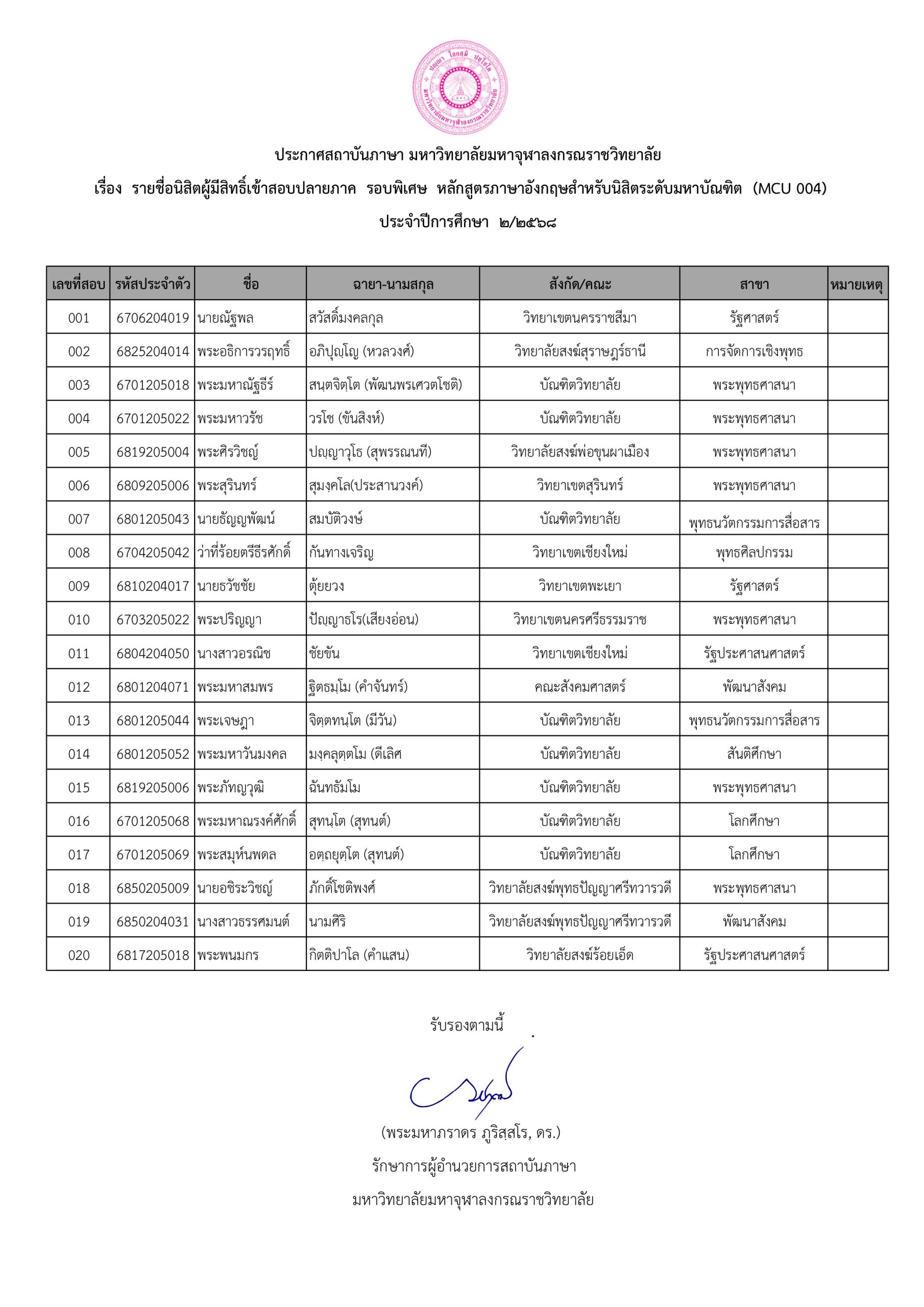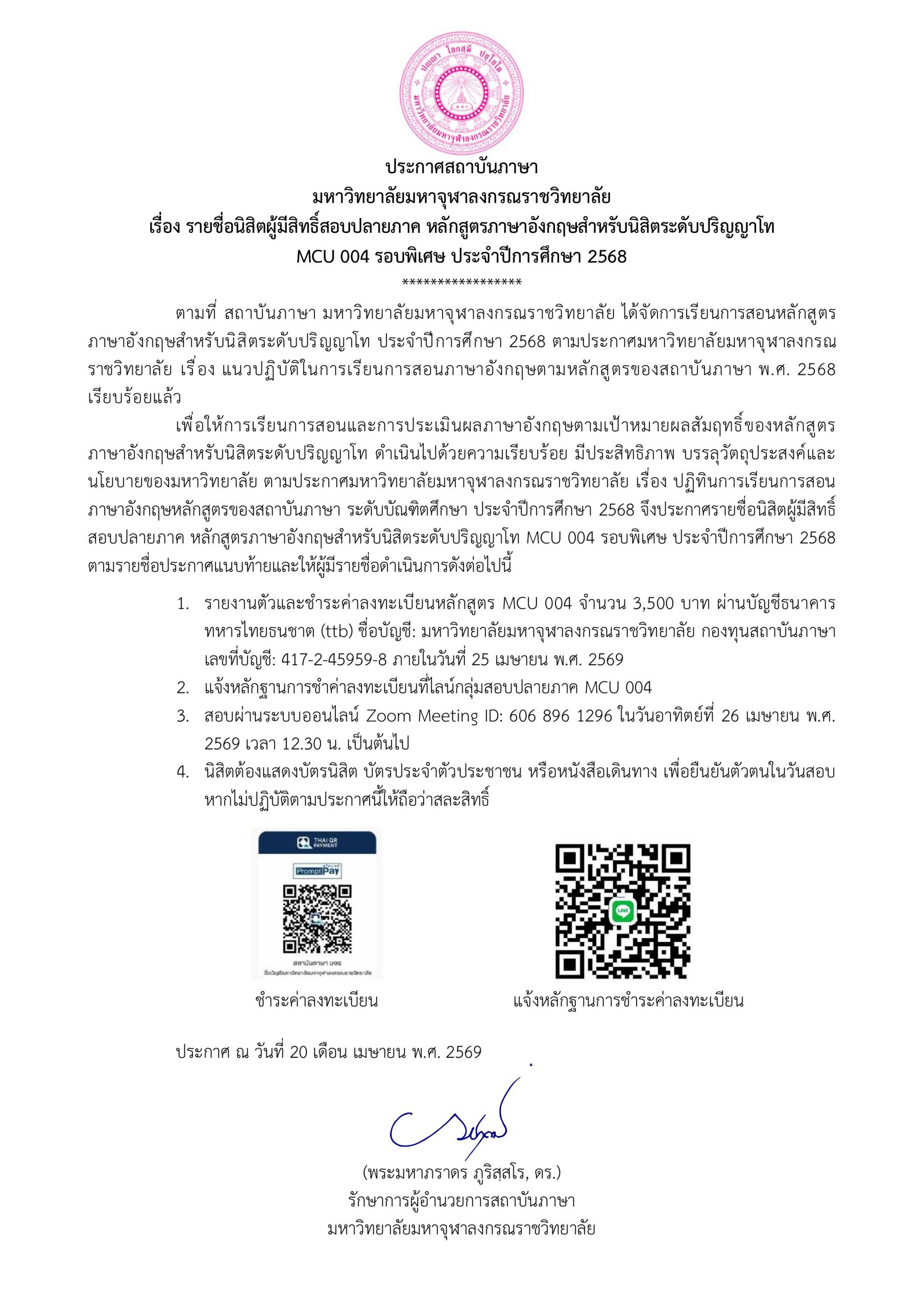 รายชื่อนิสิตผู้มีสิทธิ์สอบปลายภาค หลักสูตรภาษาอังกฤษสำหรับนิสิตระดับปริญญาโท MCU 004 รอบพิเศษ ประจำปีการศึกษา 2568