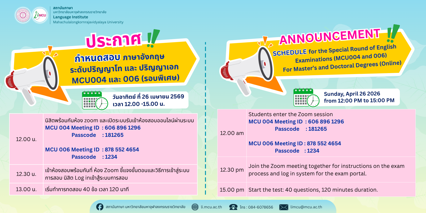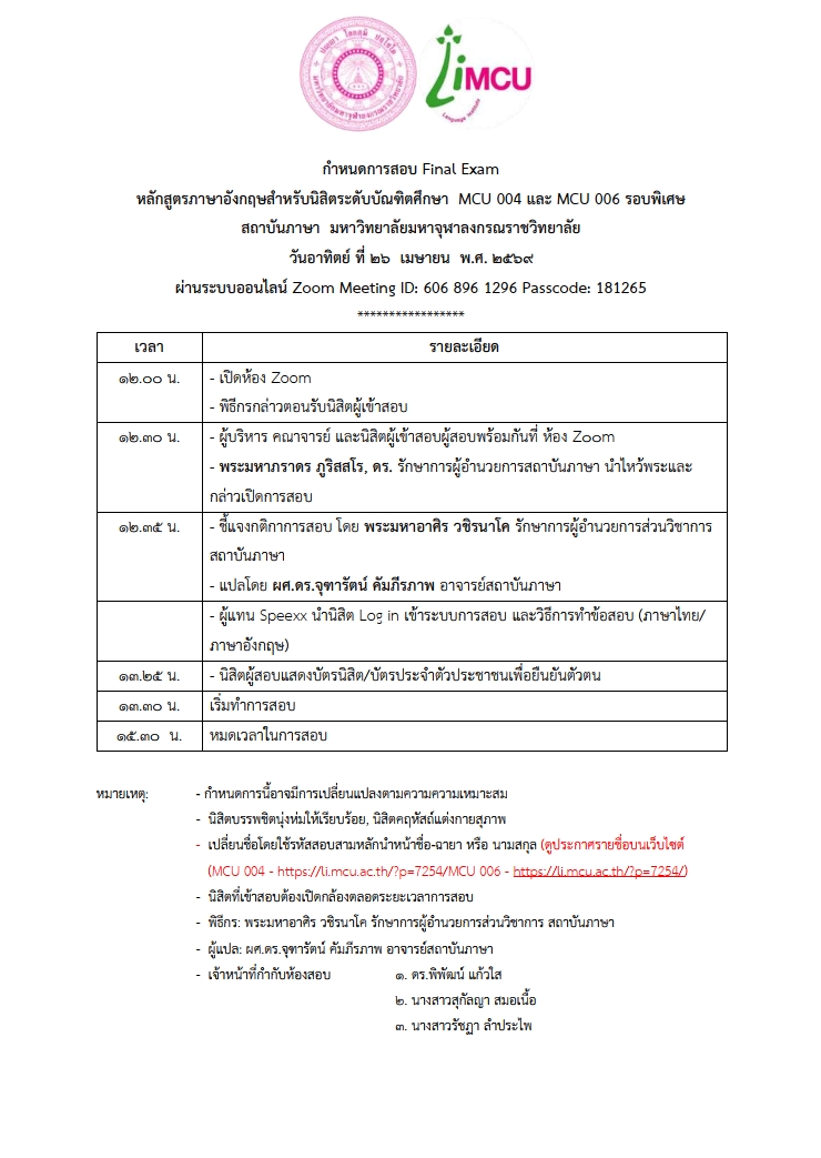 สถาบันภาษา มหาวิทยาลัยมหาจุฬาลงกรณราชวิทยาลัย จัดสอบภาษาอังกฤษ Final exam MCU 004 สำหรับนิสิตระดับปริญญาโท และ MCU 006 สำหรับนิสิตระดับปริญญาเอก