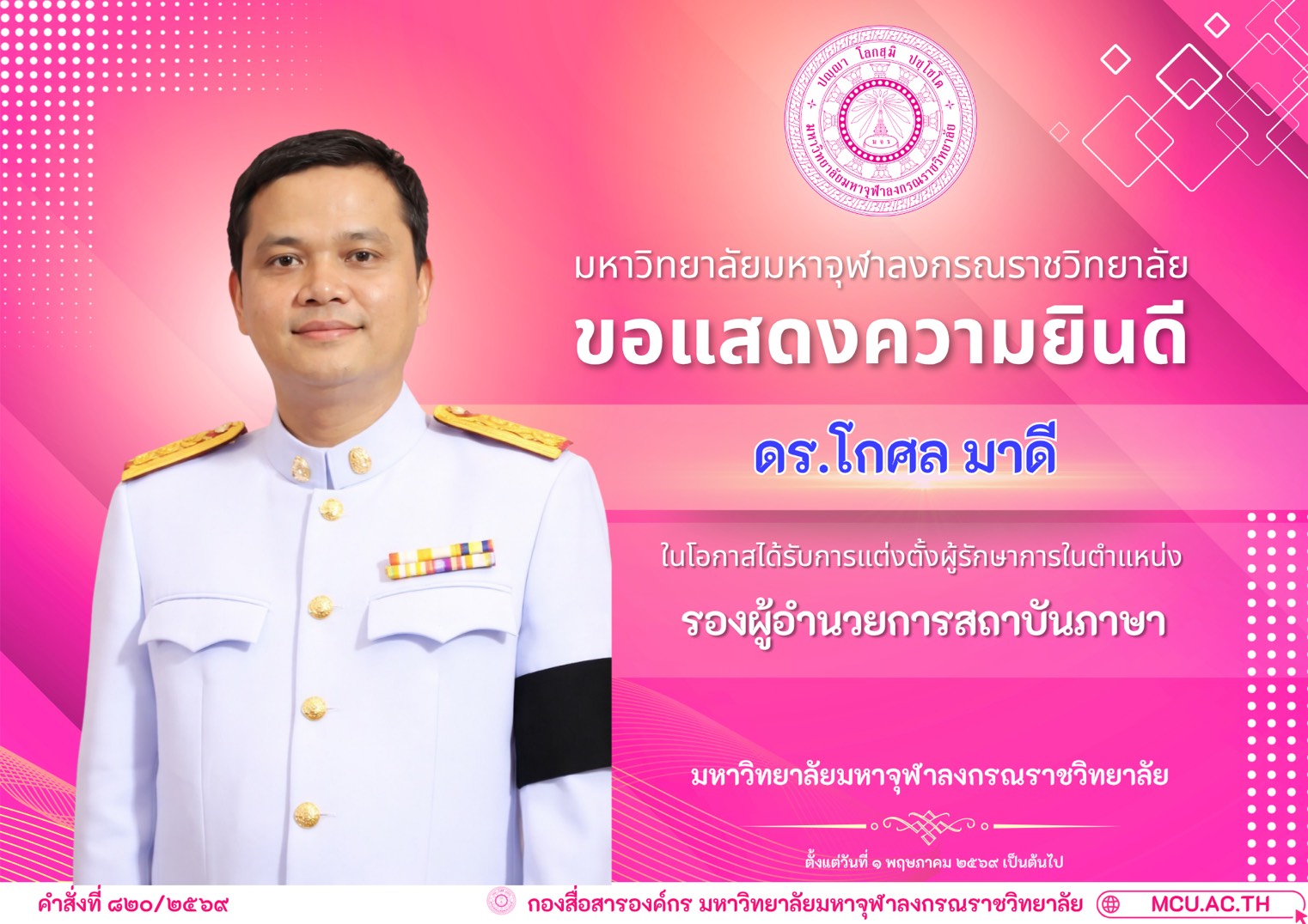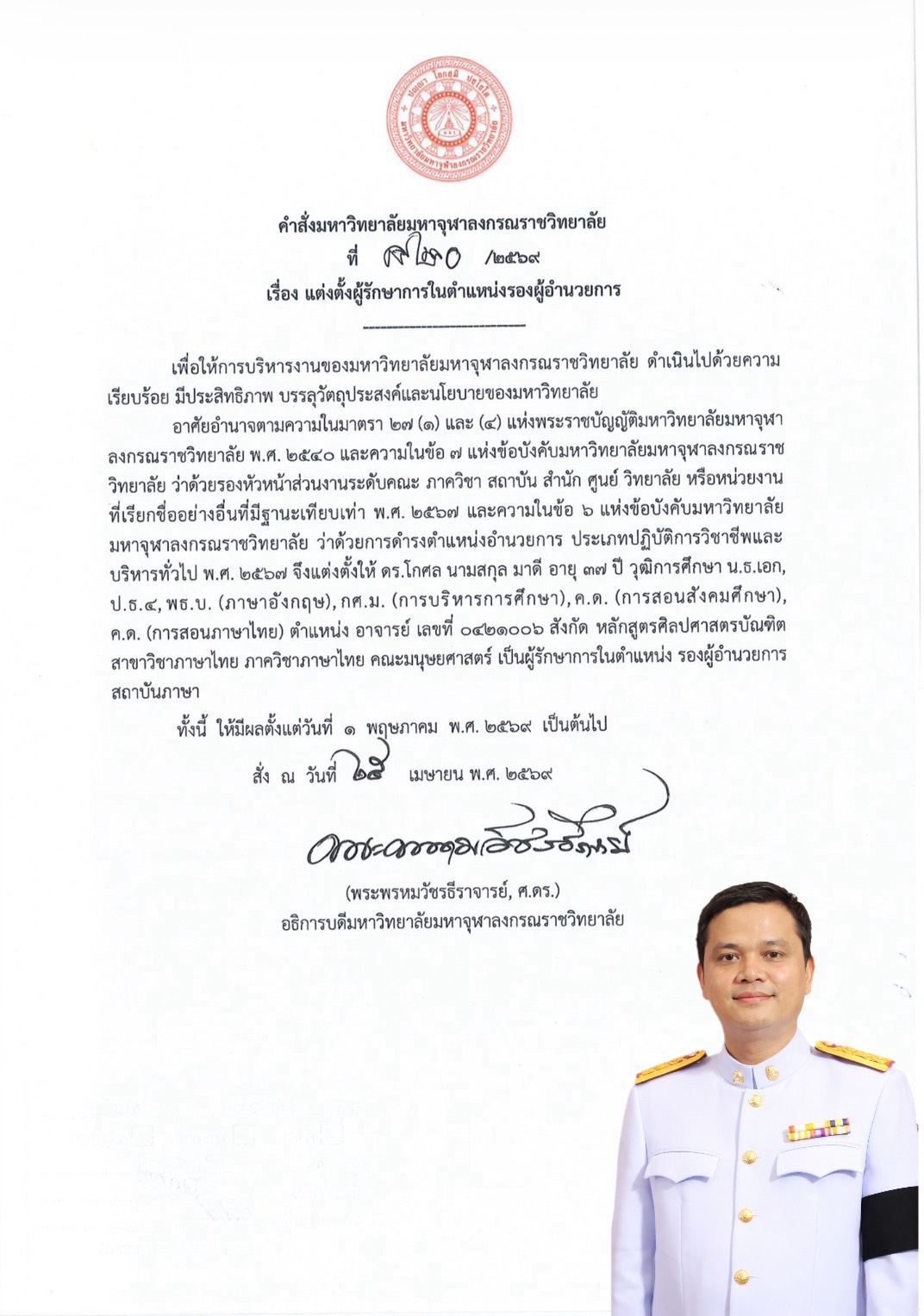 อาศัยอำนาจตามความในมาตรา ๒๗ (๑) และ (๔) แห่งพระราชบัญญัติมหาวิทยาลัยมหาจุฬาลงกรณราชวิทยาลัย พ.ศ. ๒๕๔๐ และความในข้อ ๗ แห่งข้อบังคับมหาวิทยาลัยมหาจุฬาลงกรณราชวิทยาลัย ว่าด้วยการดำรงตำแหน่งอำนวยการ ประเภทปฏิบัติการวิชาชีพและบริหารทั่วไป พ.ศ. ๒๕๖๗ จึงแต่งตั้งให้